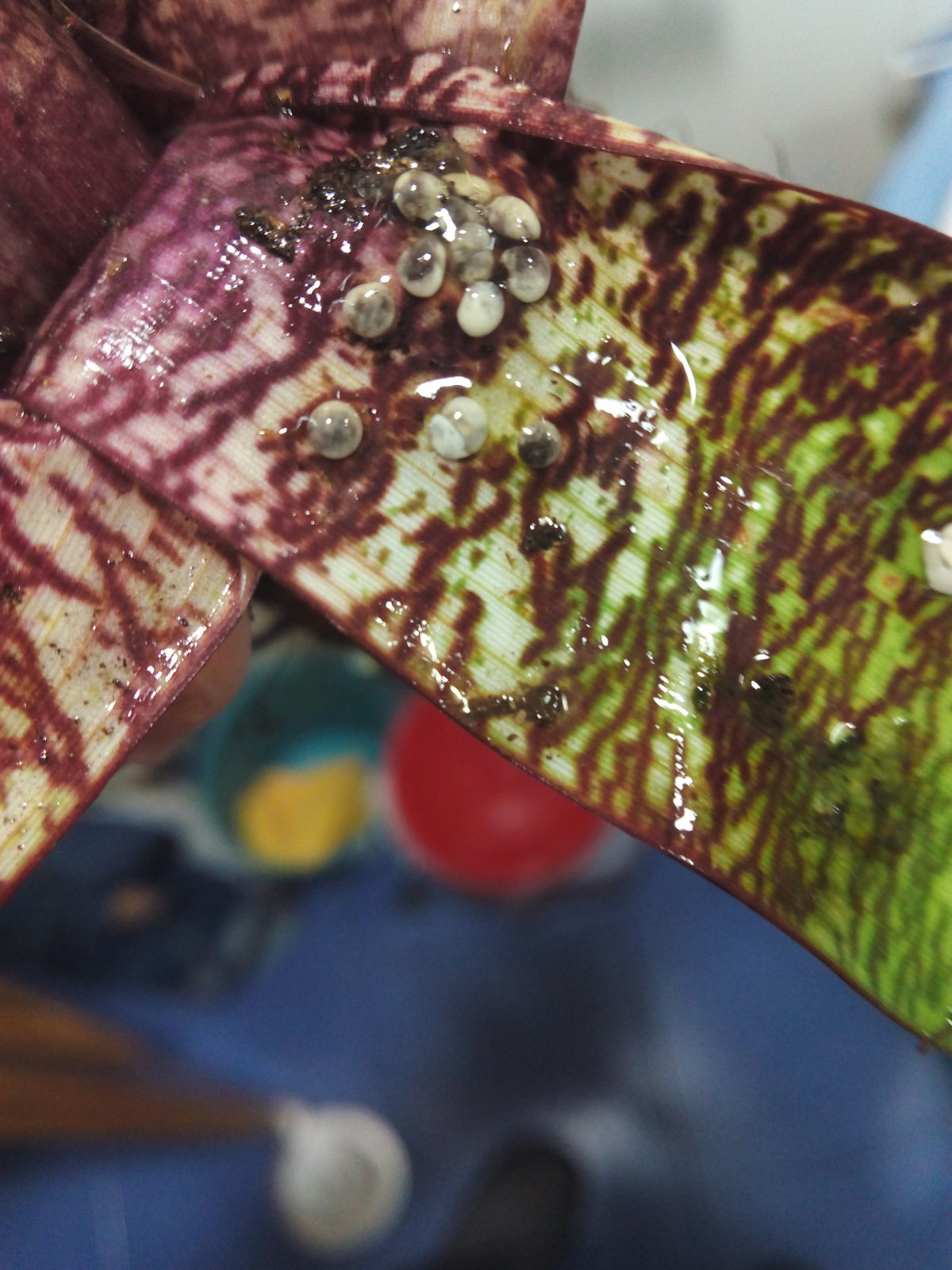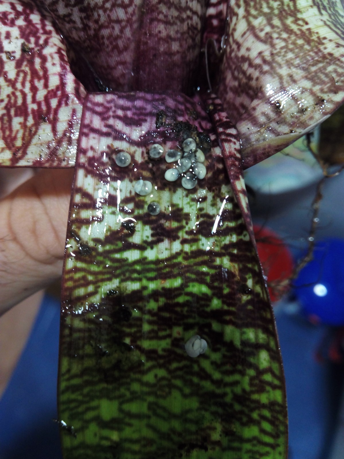 Bueno pues hoy, en el terrario de las leuco y las tricolor, he retirado una bromelia que se hizo demasiado grande, ya que estaba poniendo todo patas arriba, digo, aprobecho y limpio las plantas hago una pequeña poda y ya de paso, pongo un par de bromelias nuevas en el sitio de la antigua y todo perfecto.Bueno al estar limpiando las hojas de las bromelias con agua...¡¡Me he encontrado la primero puesta de mis tricolor!!!!!!!! no era fertil, pero es una buena señal ya que tengo un par de machos bastante cantarines, aver si tengo suerte y este año consigo criar que tengo unas ganas tremendas, ahora a leer mucho informarme más y esperar....