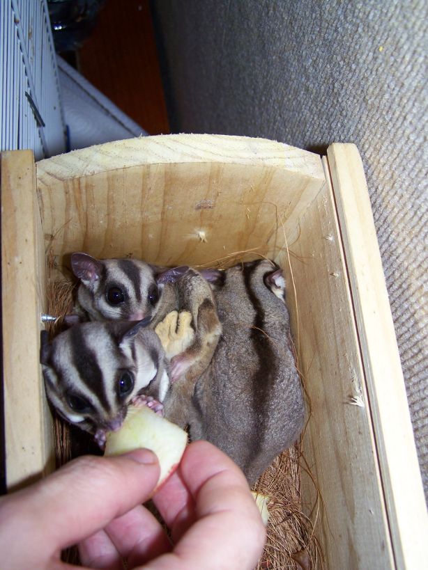 Hola, yo tambien tengo una pareja de petauros, la compre con una cria, la cria la separe de la madre hace ya 1.5 meses, y me gustaria saber cada cuanto tiempo crian, otro tema es la alimentación, yo le preparo una mezcla de frutas y la papilla de miel,etc.., no se si debo darle algo mas. Os pongo una foto de la cria, si os fijaes le salen las pupilas blancas, no es un defecto de la camara, es ciega o casi ciega, pero se maneja y come perfectamente por su jaula, esta muy gordito, un saludo a todos.