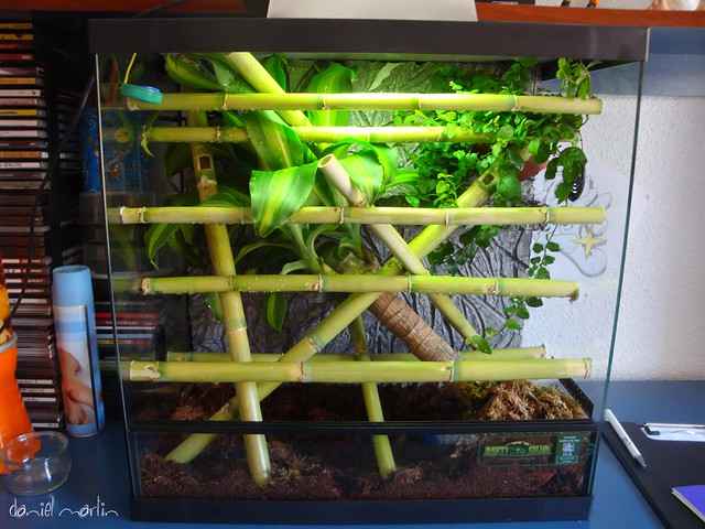 En cuanto a los bambus, pues es que a mi me gustan los terrarios un poco recargados con vegetación, sitios para esconderse trepar y mas, lo malo es que sólo los pillo cuando estan en el bambu alto tomando el "sol", pero espero que poco a poco se acostumbren mas!