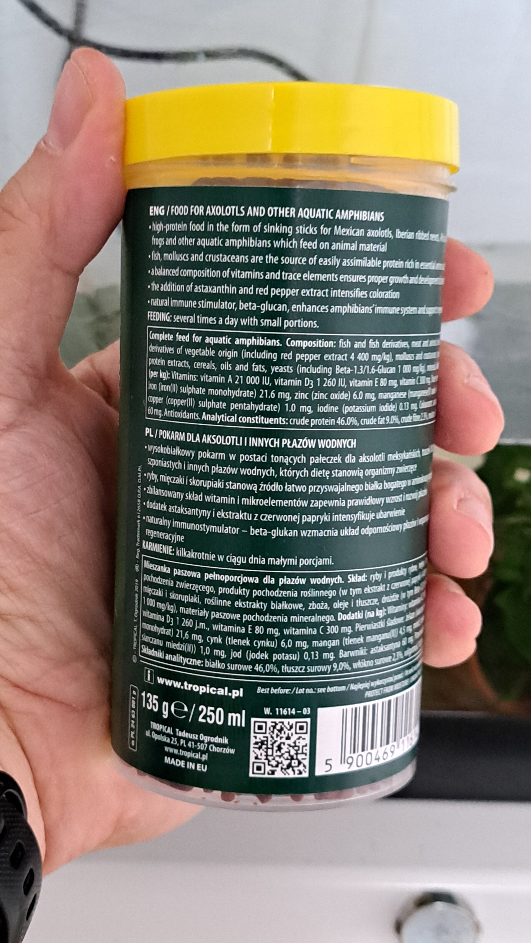 Es interesante que tienen diferente granulometría para distintos tamaños, incluyendo una minúscula que yo utilizaba para larvas avanzadas de tritones. De todas formas últimamente optaba por Repashy Grub Pie, al menos hasta que por culpa del Brexit dejó de poder traerse.
