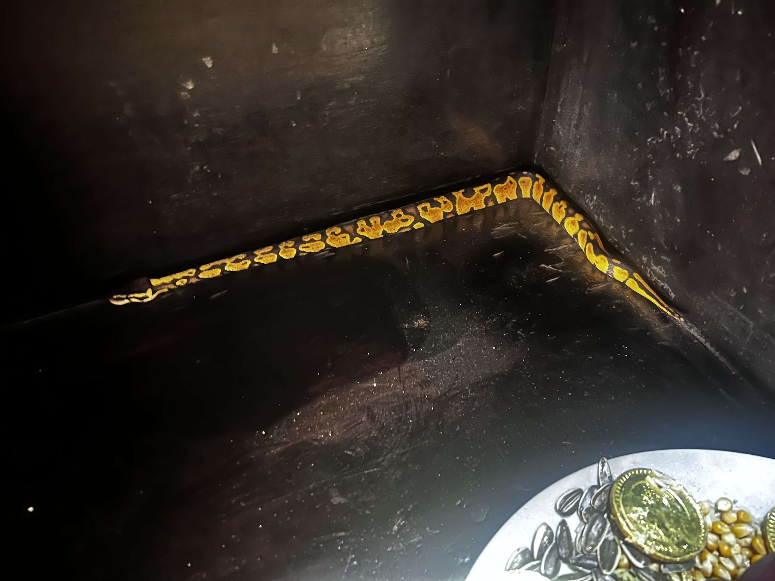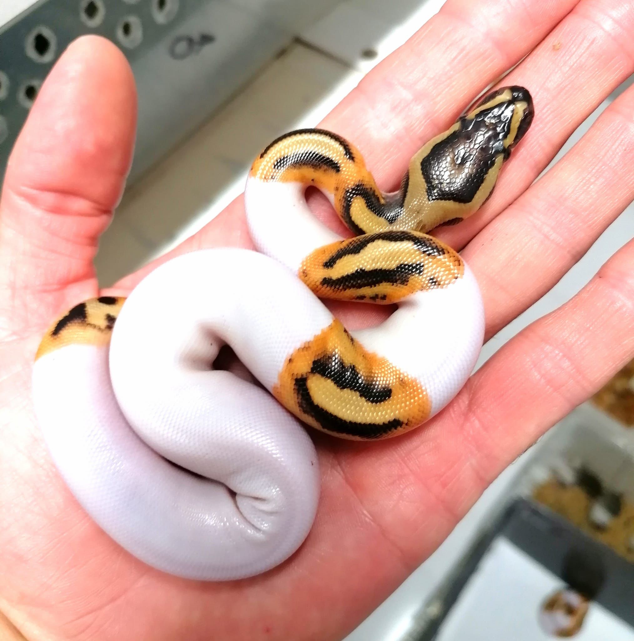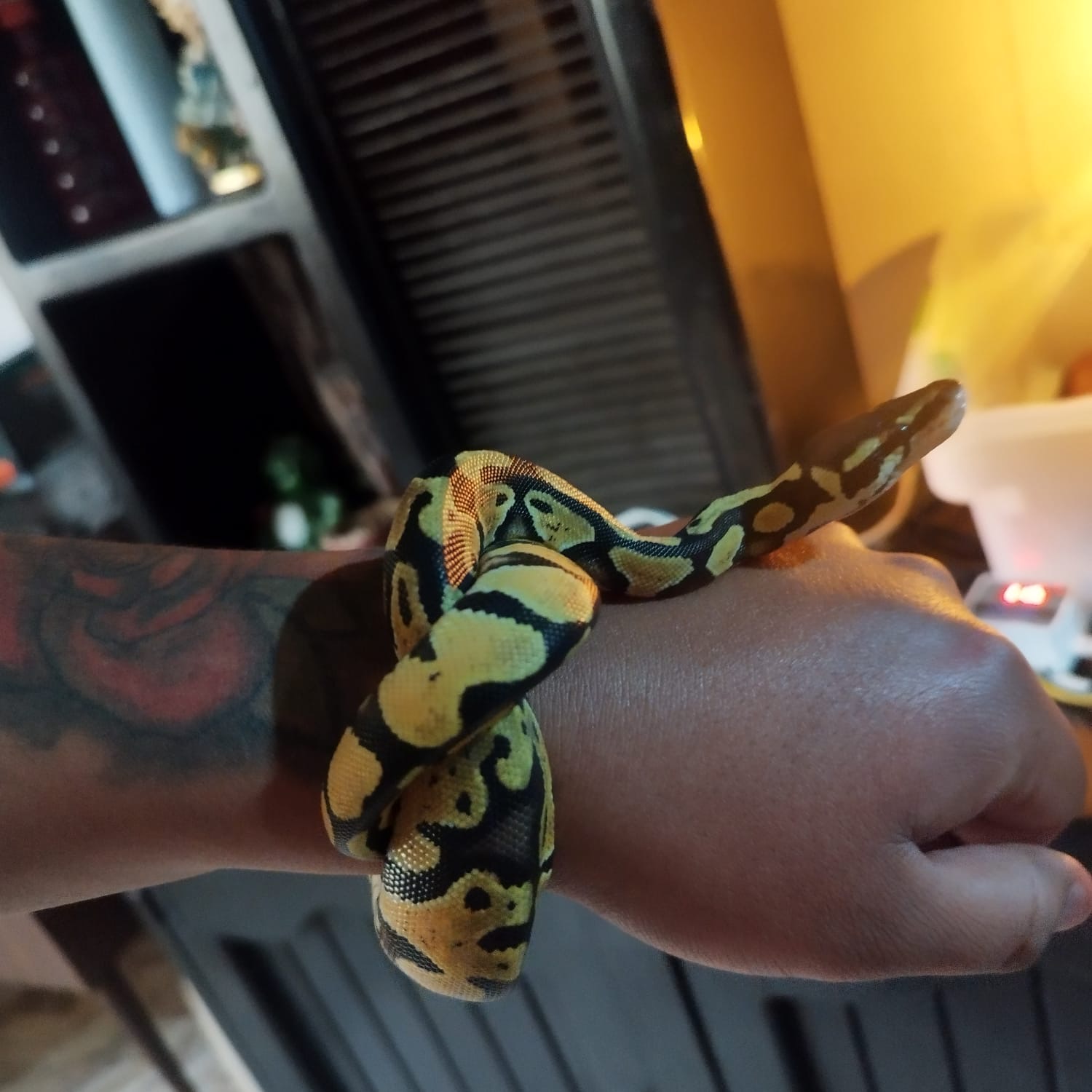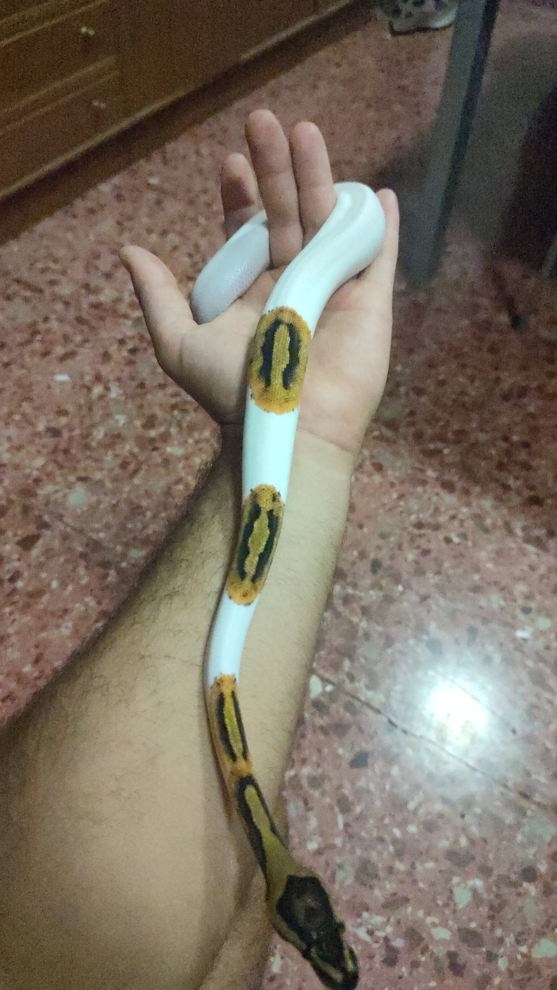Yo nuevamente me compré mi pitón bola tiene 4 meses aprox y pesa 94 gramos, al estar manipulando se enrosco en mi muñeca y no me soltaba y en eso abrió la boca como si fuera un bostezo cave mencionar que llevaba 6 días sin darle alimento y no había manipulado su alimento antes de manipular a mi ejemplar, estaba leyendo en internet y comentan que posiblemente se preparaba para comer Dx me dio un poco de nervios y quisiera saber su opinión, espero contar con su ayuda, dejo la imagen de cómo le agarró de la muñeca y al querer dejar en su terrario fue cuando abrió la boca