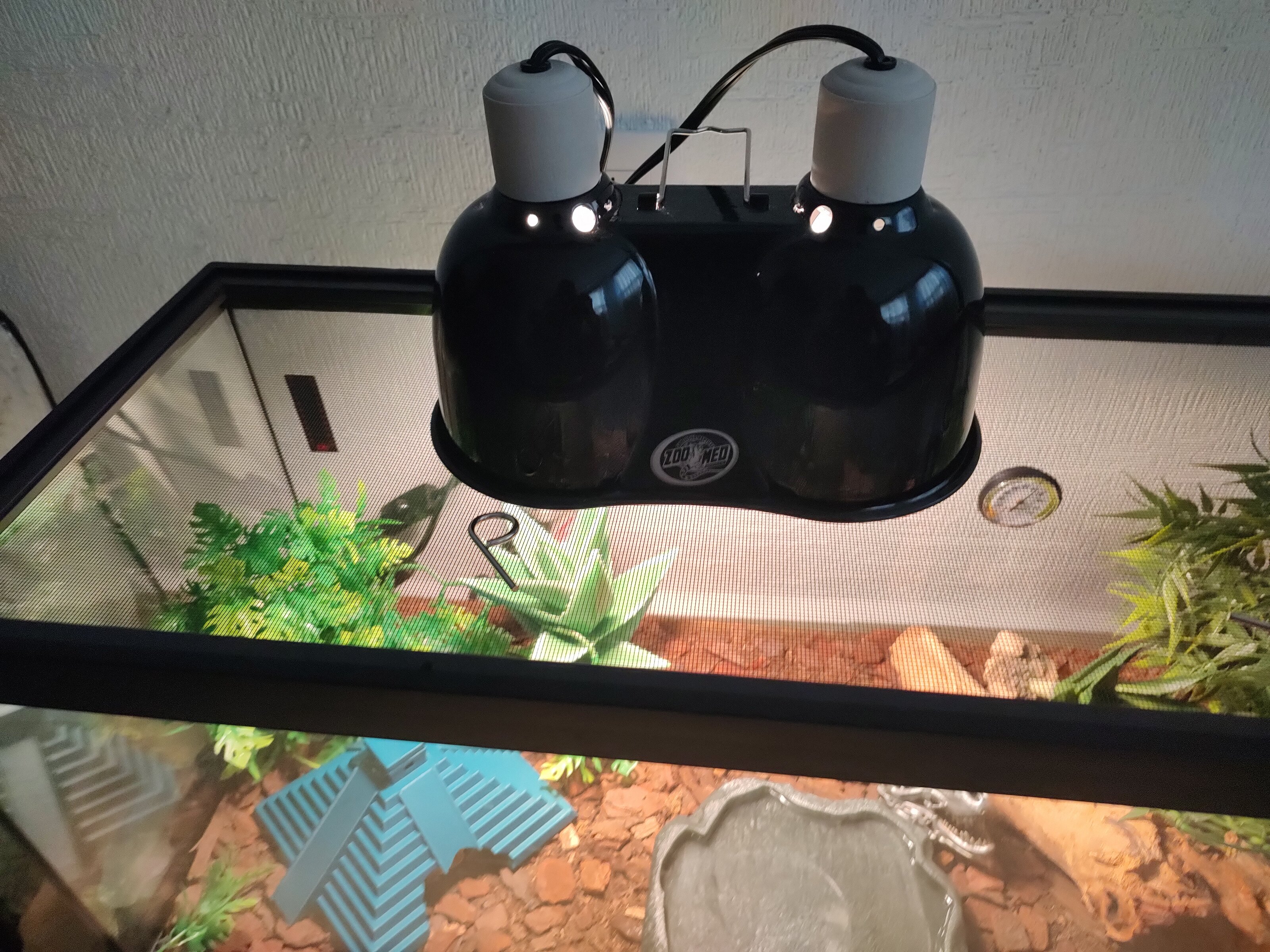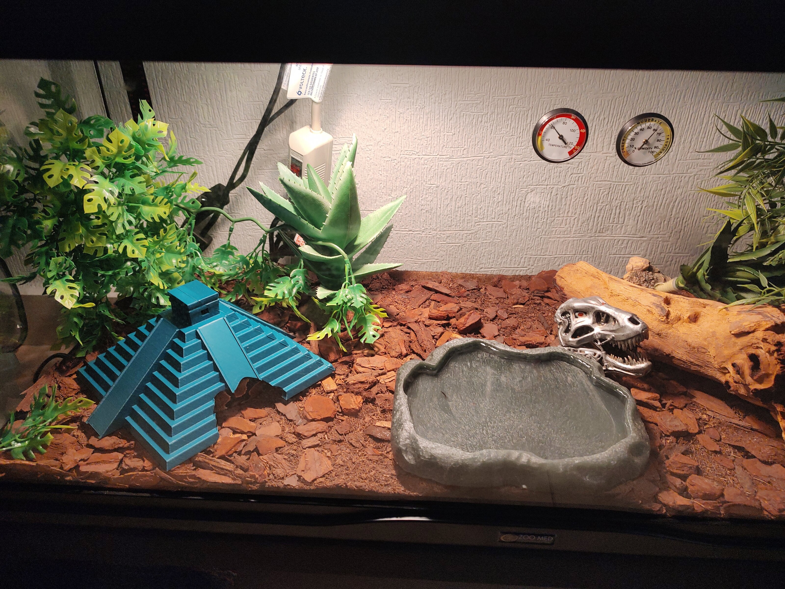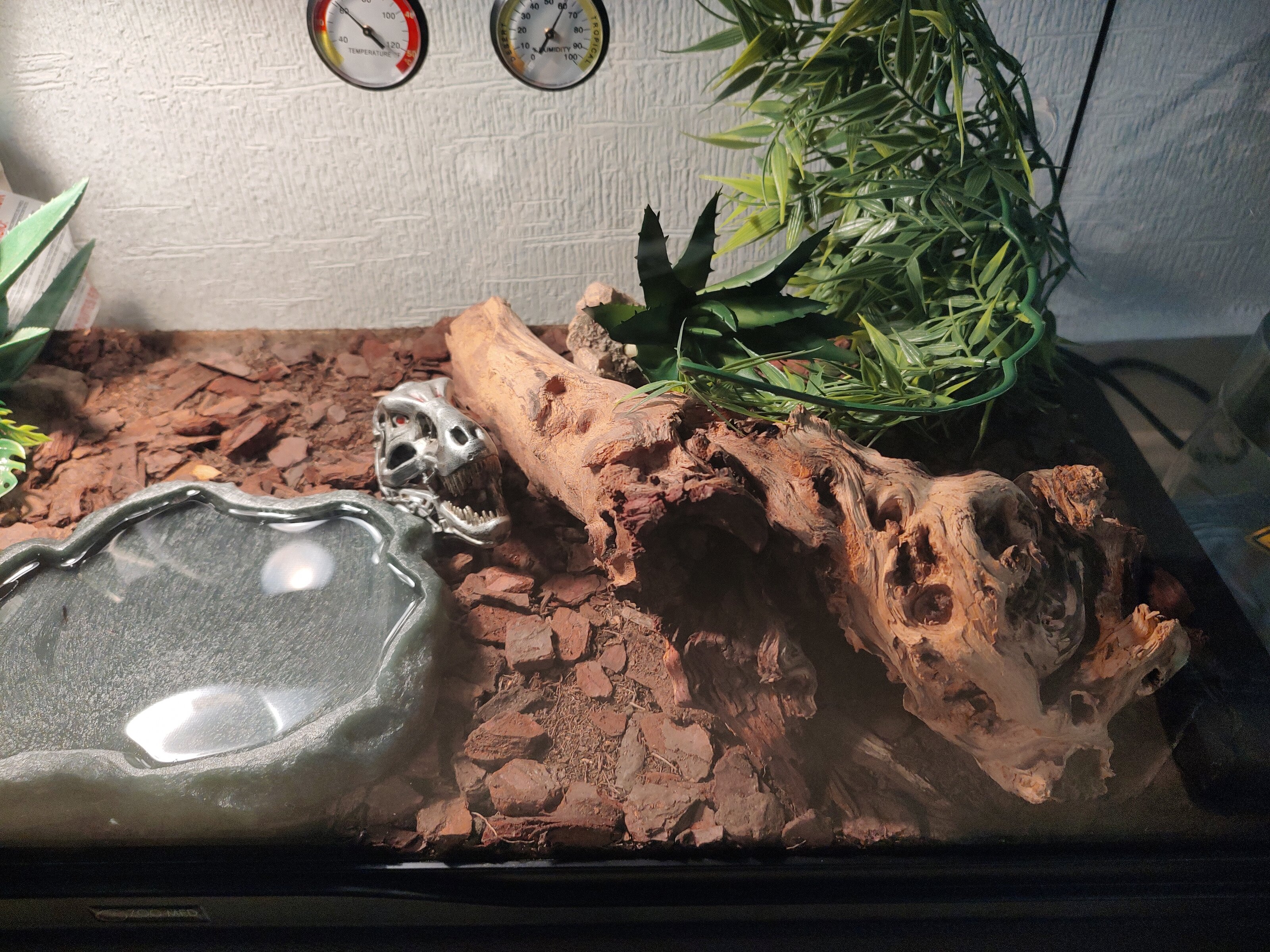 Tiene 3 semanas con el sustrato de coco y viruta de madera media, la he mantenido con su foco calentador, placa termica por debajo y su foco UV, los focos solo durante el día y casi diario le agrego agua con un atomizador regular, la humedad suele estar entre el 50 y 60% algunos días sube más pero nunca baja del 40%, donde vivo la temperatura es baja así que nunca apagó la placa termica y le doy baños de agua tibia a 34° - 30°, pasado ayer fue la primera vez que le di un ratón de adulto porque con el ratón de subadulto le da mucha hambre en vez de comer a los 8 o 10 días como me dijeron a los 5 días andaba buscando comida