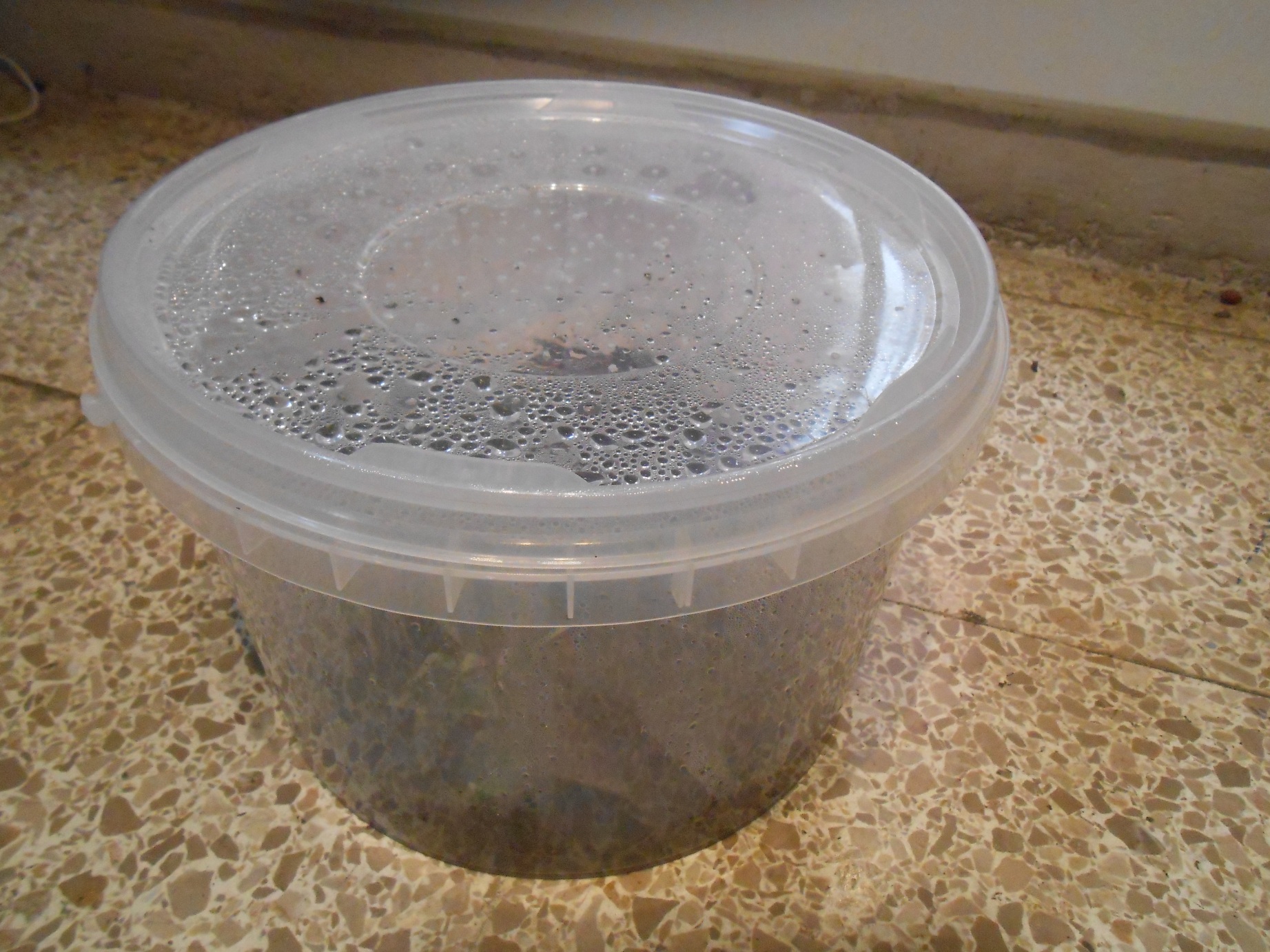 Si que es verdad que había mucha humedad en el tuper, pero como iba a ser provisional solo para unos días lo dejé. Ahora en el terrario ya no sube tanto.