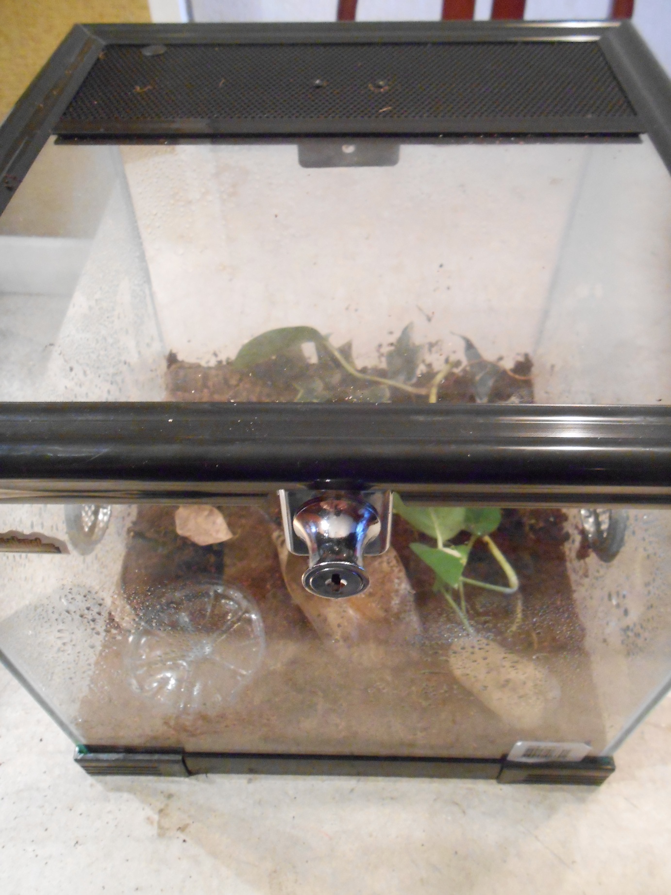 Las dos primeras fotos son de como la he tenido estas semanas antes de pasarla al terrario. Es un tuper suficientemente alto, que cerraba bien y le hice agujerillos por la tapa.