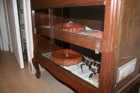La casa.... un mueble transformado en cuatro compratimentos. Antes estaba dividido solo en dos compartimentos pero desde que reduci la altura al dividirlo en cuatro compartimentos las serpientes se sienten mas refugiadas y con menos necesidad de esconderse. Un consejo para ver mas a menudo las serpientes fuera: Reducir la altura del terrario en el que estan