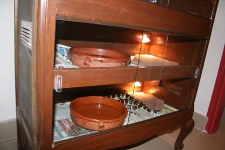 Evidentemente cada compratimento tiene un bebedero ceramico y una trozo de teja como refugio