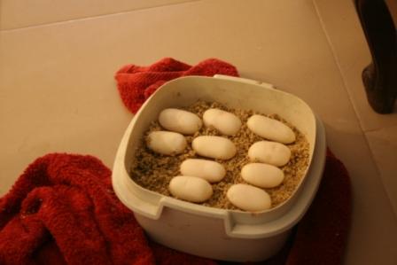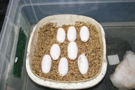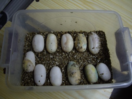 Y esta la segunda puesta que puso la hembra a finales de agosto ... por falta de otra alternativa me vi obligado a poner los huevos en una incubadora con demasidad ventilacion lo cual no ha sido buena idea. Consejo: Cerrad la incubado completamente para un maximo de humedad para la oxigenacion basta con las veces que abramos la tapa para controlar la puesta.