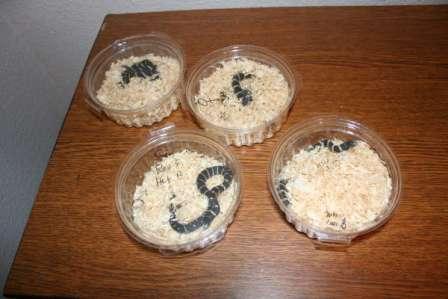 Y estos son los cuatro pequeños naufragos que han quedado de los nueve huevos que puso la hembra en su segunda puesta. Los cuatro han salido con fase anillada. Algunos eran infertiles (o se han secado por el exceso de ventilacion) y hubo un infortunado accidente a la hora de cerrar una tapadera. Consejo: Sin prisas y mirando bien a la hora de cerrar los tupers