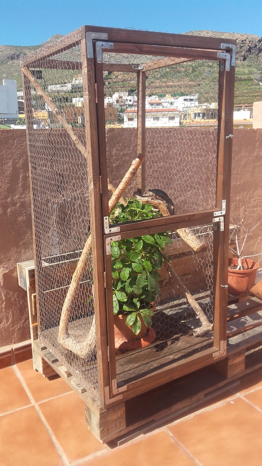 Esta muy bien el terrario de verano, pero yo le pondría un lateral cubierto con plantas colgantes o enredaderas, aunque sean artificiales...de forma que no le tapen el sol, pero que tenga un lugar donde refugiarse si tiene demasiado calor.