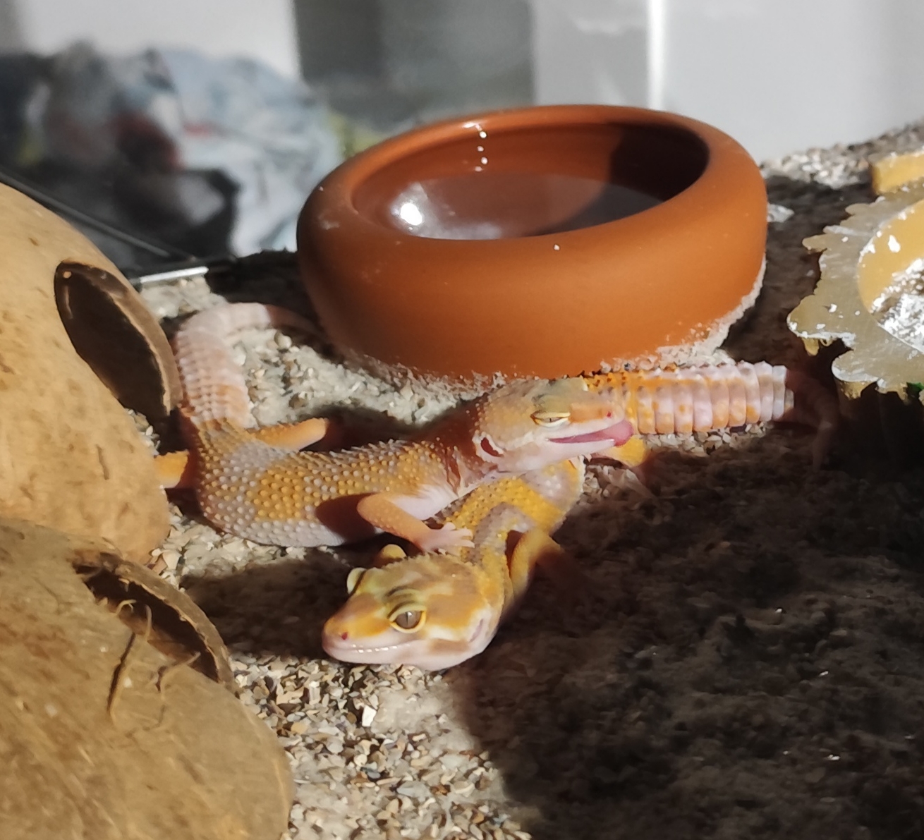 Hola! Soy Jana. Os presento a mis dos hembras de gecko leopardo: Eco (la que está abajo) y Nyx (la de arriba). Suelen dormir juntas y sus personalidades son muy distintas: Eco es una glotona de manual, muy viva y curiosa. Nyx es muy tímida y bastante torpe a la hora de "cazar" o coger el alimento de las pinzas, pero mi pequeña es muy lista y sabe que salir fuera del terrario es la mejor forma de comer tranquila. Podría decirse que Eco es mucho más dominante, aunque no ha habido ninguna pelea, por lo que intento salvar esas diferencias maniobrando como puedo con mis pequeñas. Aunque no les disgustan los tenebrios, prefieren mil veces más los grillos, pero me han comentado que es mejor dar grillos un día sí y un día no.