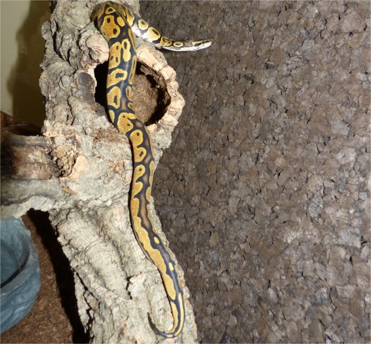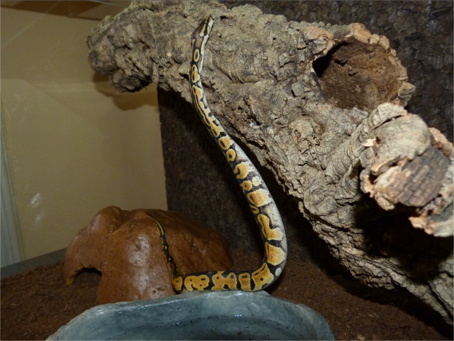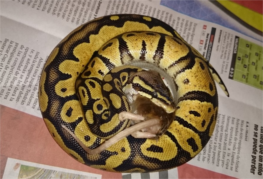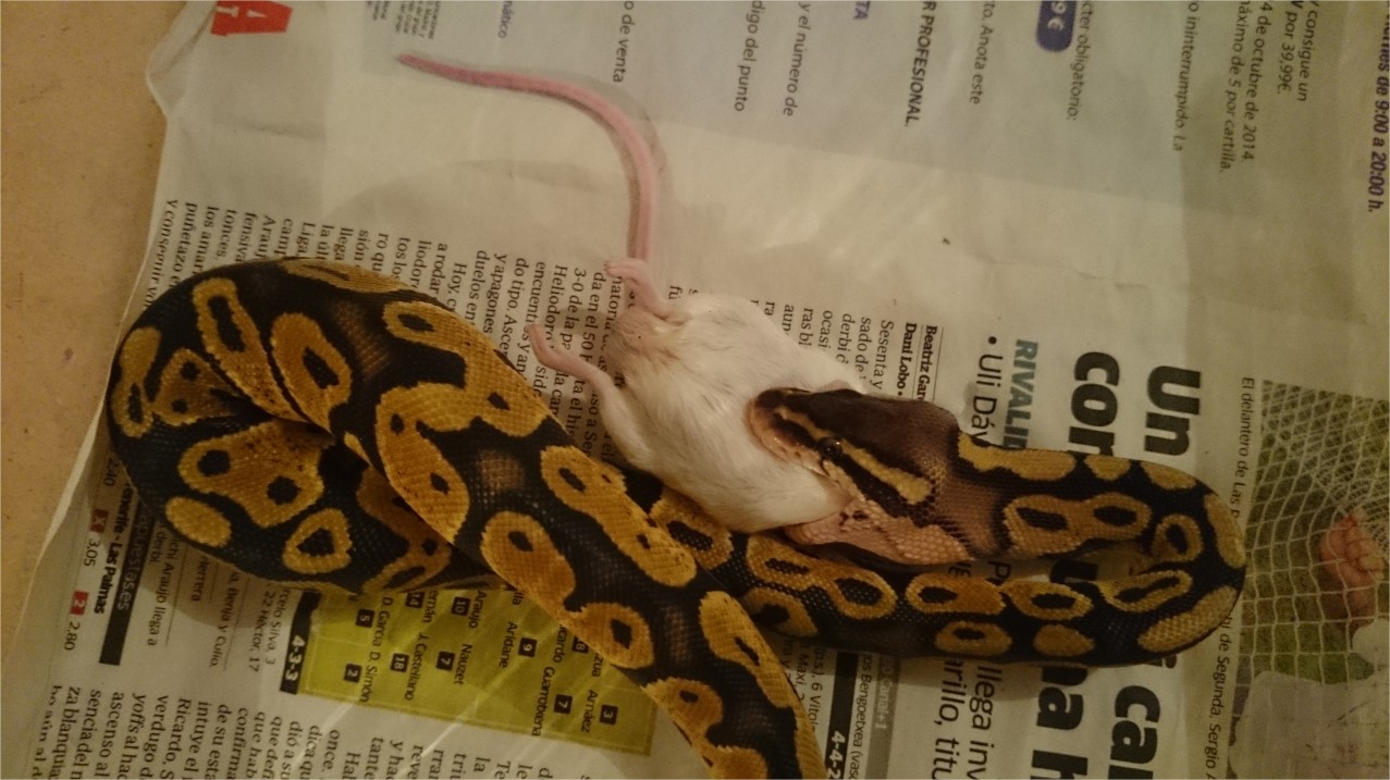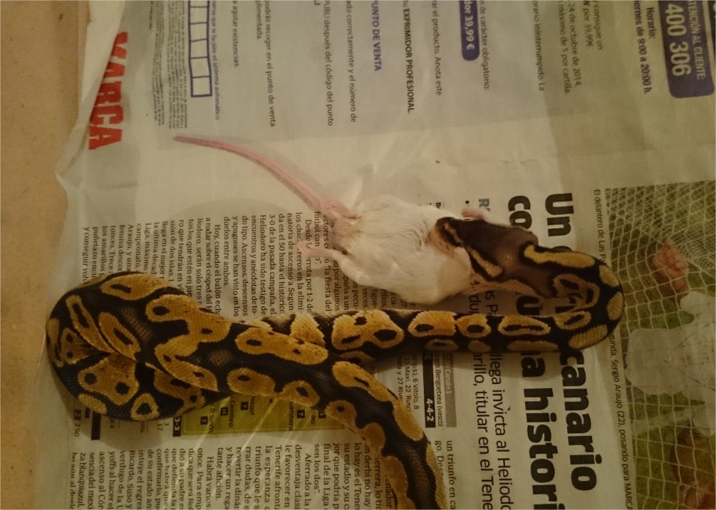 Ya ha miccionado y defecado por primera vez. Hoy intentaremos que coma una rata congelada. A ver si hay suerte y se porta tan bien como con el ratón.