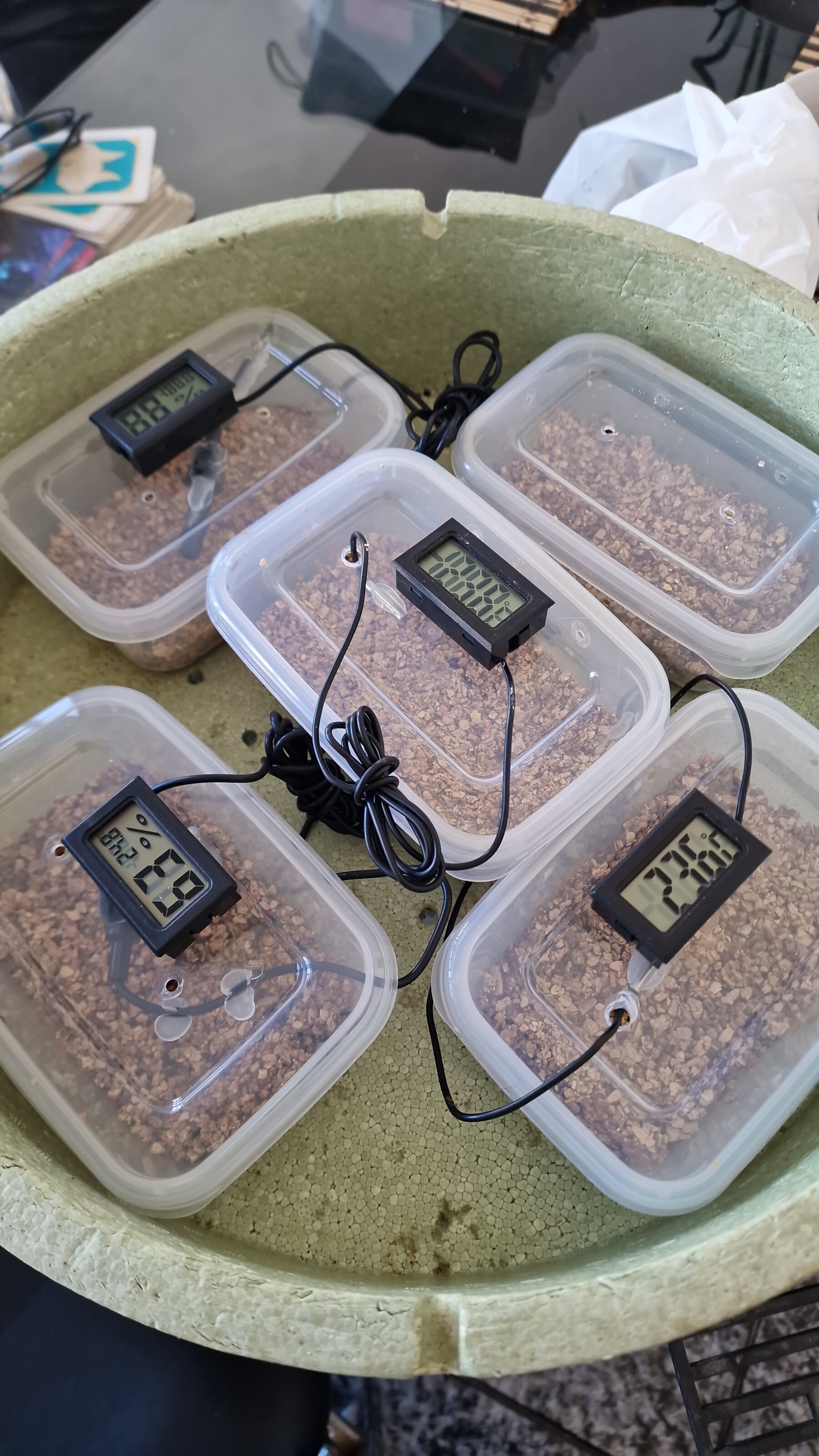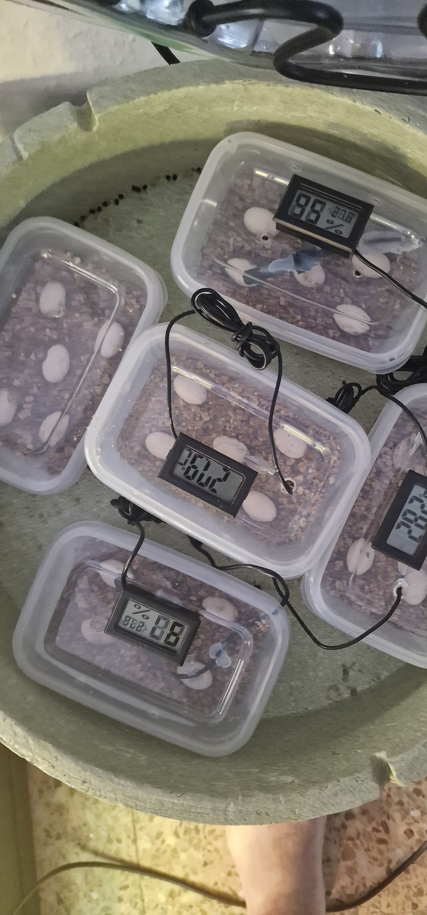 Empecé a escarbar a eso de las 23h de la noche y poco a poco fui sacando los huevos sacar los 25 huevos me costó 2h jajajajaa porque los puso en una esquina incómoda, los puse a incubar en una incubadora que compre, los acomode y los tengo a 27grados, espero tener más hembras en 15 días voy a ver si están fértiles o no, revisar que están buenos y tenga humedad, tengo 5 tapers con 5 huevos, los puse con verticulita húmeda, y tenen un medidor cada uno ( Me paso de controlador jajajajaa en unos días pondré más cosas estoy son ellos (Gara la hembra amarilla y Arxhi el macho nominal) quiero saber qie mezcla sabrá en agosto compraré 2 hembras rojas :)