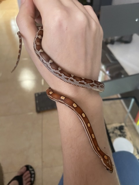 Mi Guttata agita la cola y como que me mira mucho la mano asi enroscadita, no se si modo ataque o no ya que no conozco el comportamiento ofidio....