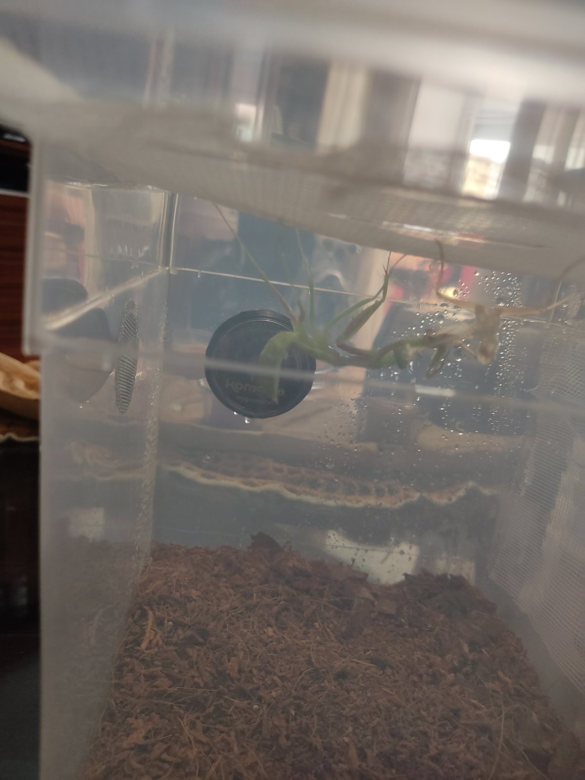 Para alimentarlo recomiendo pupas de mosca: se corta con unas tijeras la parte de arriba de la pupa y se presiona como si una lata de refresco se tratase, al tiempo que sostienes con la otra mano la mantis; y le pones el líquido que salga sobre la boca. Verás que cada vez lo acepta mejor.