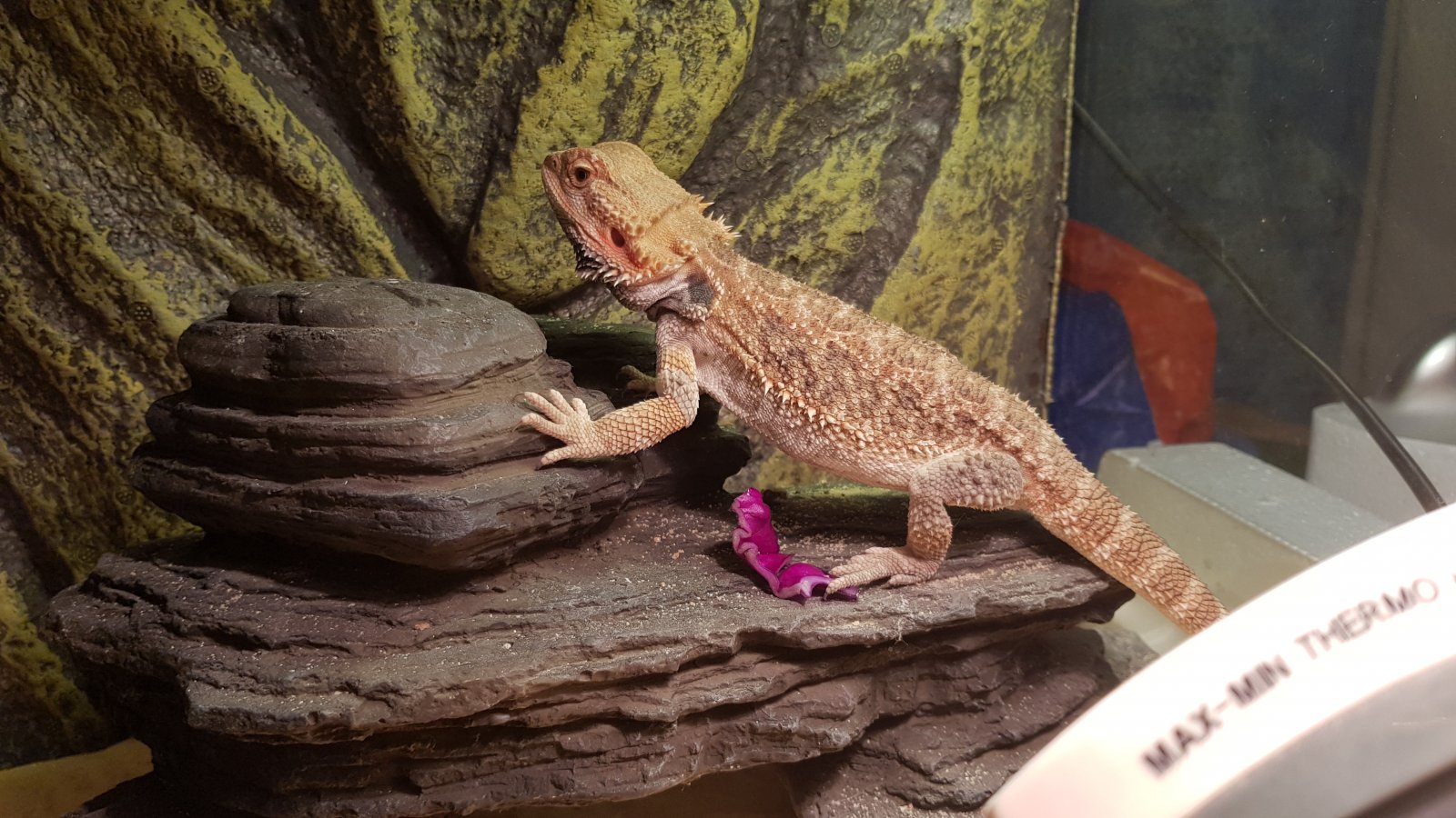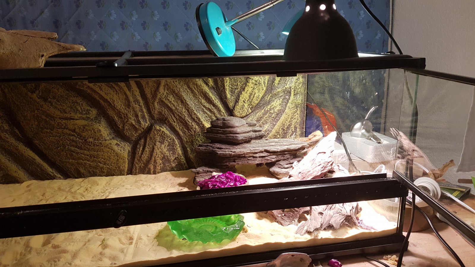 Hola buenas, adquirí una pogona en enero, era baby, la tenia en un tupper con una bombilla de 10.0 y manta debajo. Hace unas semanas le compre su casa ya grande porque creció rapido 90x45x30 y desde entonces ya no se comporta igual. Antes comia todos los grillos que le echarás y verduras algo menos pero comia, ahora se come 5 6 grillos diarios. La tengo con un spot de 50w que en el punto más caliente pilla 37 grados pero no consigo extender el calor por el terrario para tener el gradiente. Algunos consejos sobre que le puede pasar y como conseguir el gradiente? Tengo un spot de 75 pero ese se pasa de temperatura , 45 grados en el punto más caliente, ultimamente agita la cabeza arriba y abajo a menudo. Espero consejos porque ya estoy desesperado y nose que le pasa. Adjunto fotos