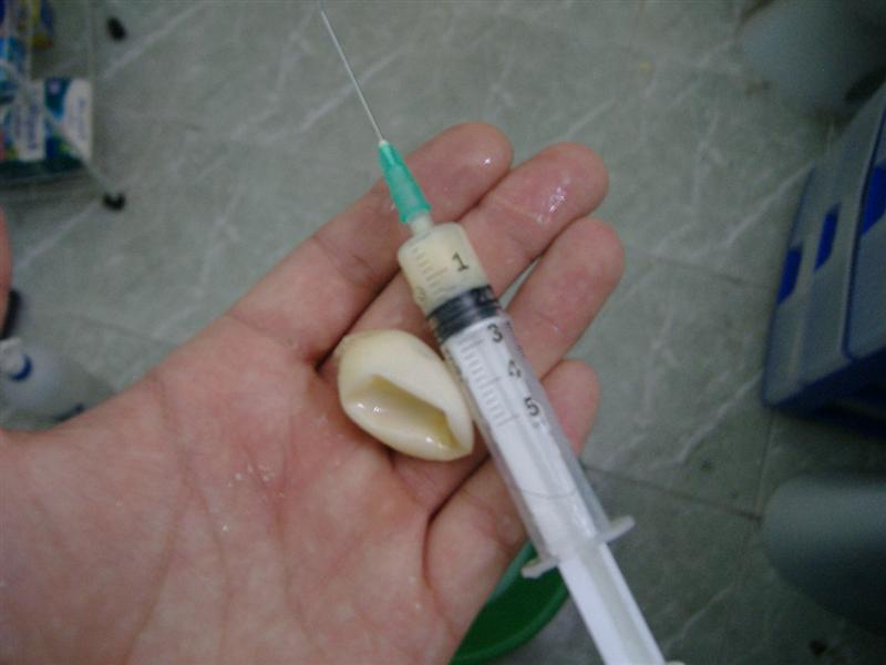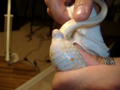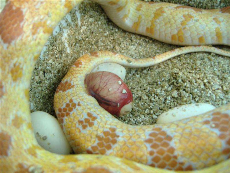 Tengo que agradecer a Rakel (Yalike) que me echara un cable via msn, dándome consejos en todo momento. Como la piel que envolvía al huevo (el prolapso) era muy fina y casi sin capilares sanguíneos, Yalike me sugirió pinchar con cuidado a través de ella, y eso hice. Lo malo es que la serpiente tiró hacia adentro del prolapso, y como el huevo aún no estaba suficientemente desinflado, esa presión desgarró la piel interna. :(