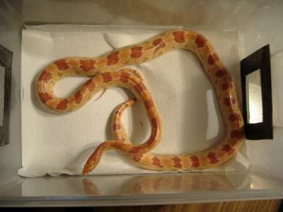 6. depositar a la serpiente en un sustrato de papel de cocina bien mojado, para evitar que se se seque el prolapso si vuelve a salir, o no se ha conseguido introducir del todo.