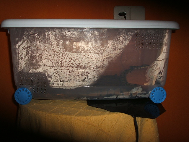 Supongo que el recipiente del agua lo tienes en la parte fria no?? Yo personalmente tendria algo mas de ventilacion en la zona fria y tambien tendria la ventilacion mas dispersa, me explico, intentaria tener los agujeros mas diseminados por el tupper, n concentrados en dos partes solo.... tendria agujeros diseminados por todo el tupper y en mayor concentracion por la zona fria para que asi por esa zona escape mas humedad ya que es la zona donde tienes el recipiente de agua. Tambien reduciria el tamaño del recipiente para asi disminuir la superficie de evaporacion (aunk en las fotos no se ve el tamaño del recipiente). Prueba con esto y seguramente te bajara la humedad, si no es asi comentalo de nuevo por aqui y pon alguna foto de como esta el tupper por dentro, pueden afectar mas cosas como el substrato y demas ;)