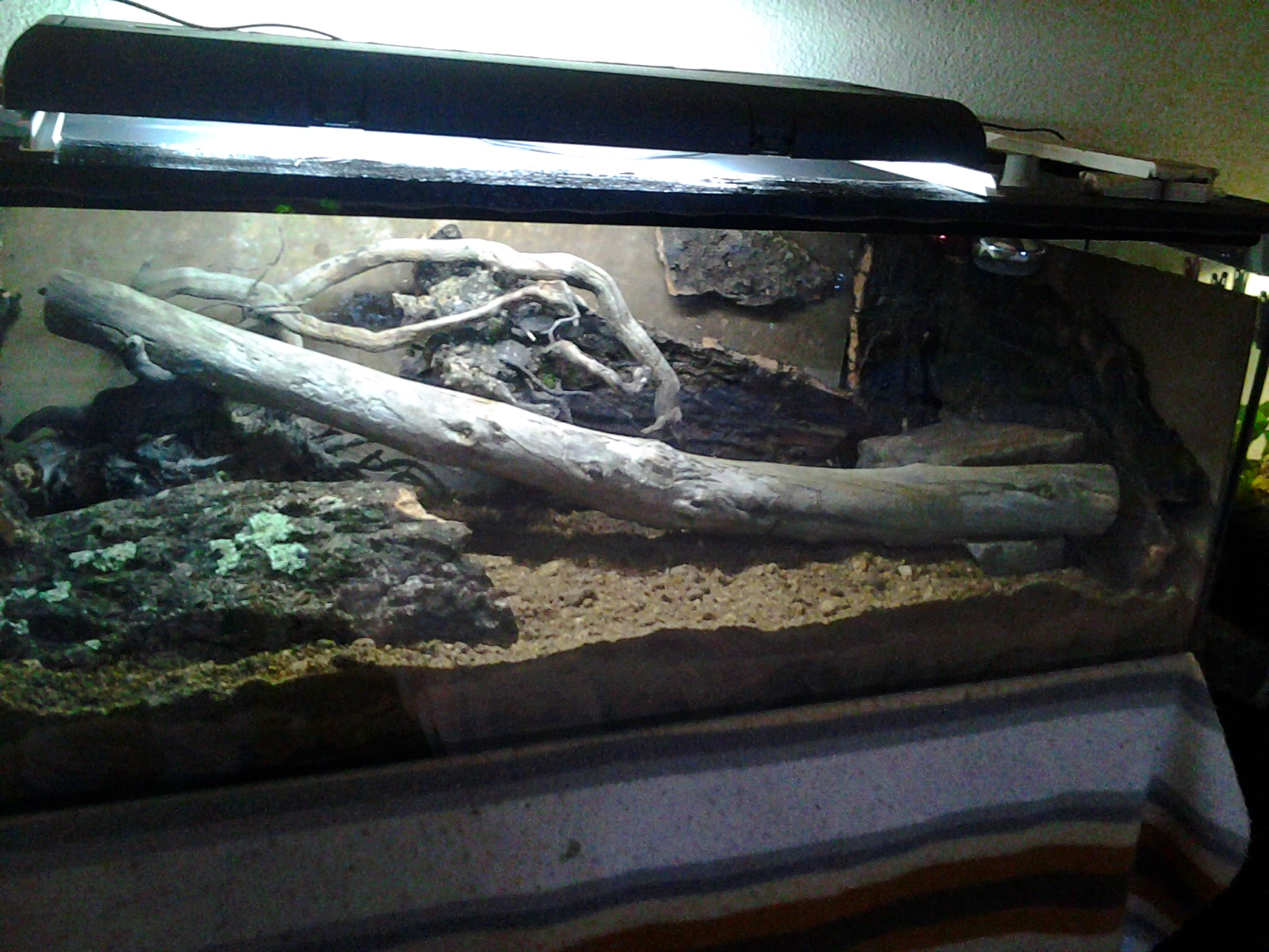 Iluminación uvb 8.0. Y con el tema del punto de asolamiento he tenido que poner 2 spots ya que con uno no pasaba de 31 grados en el punto mas caliente.