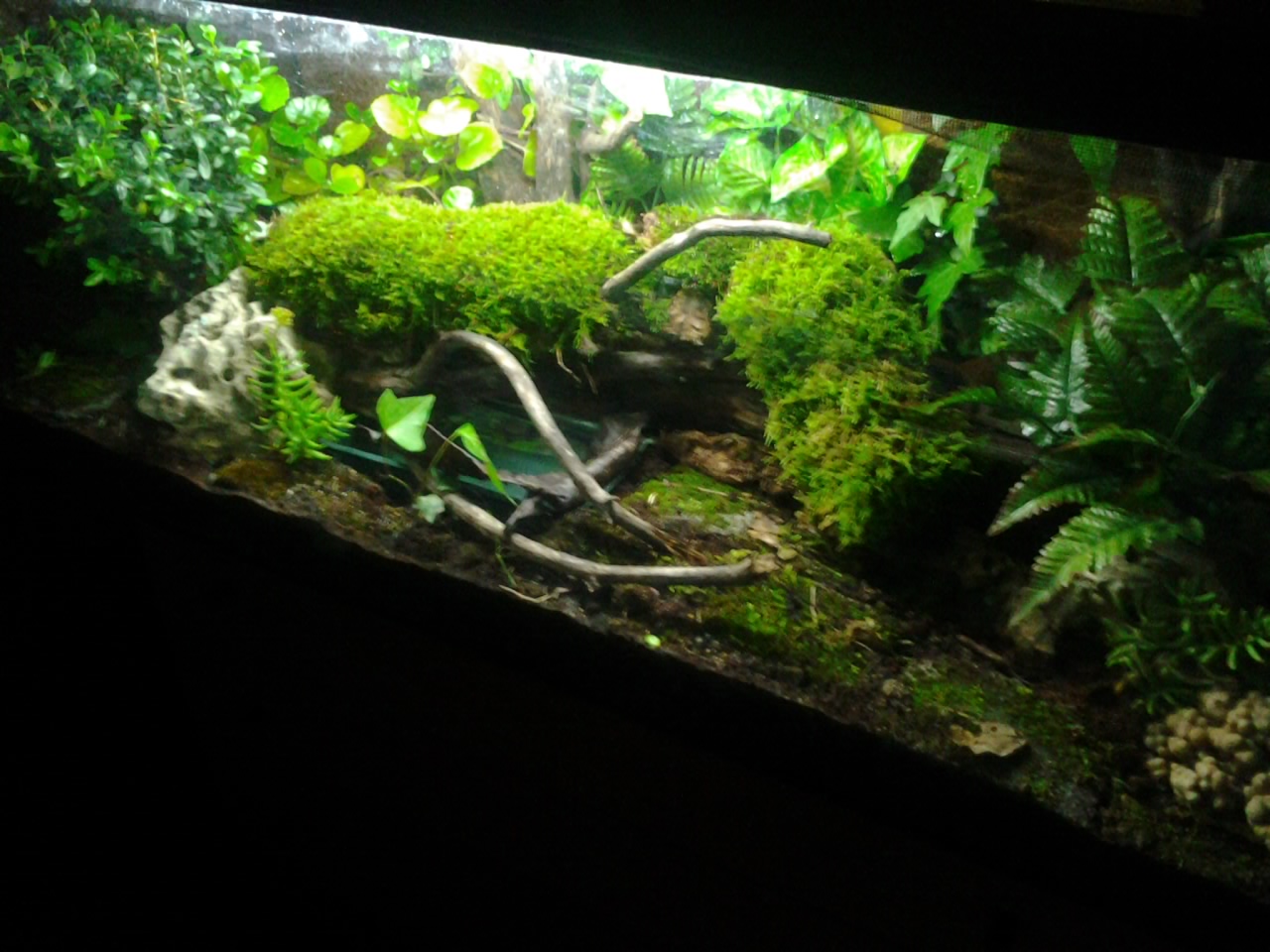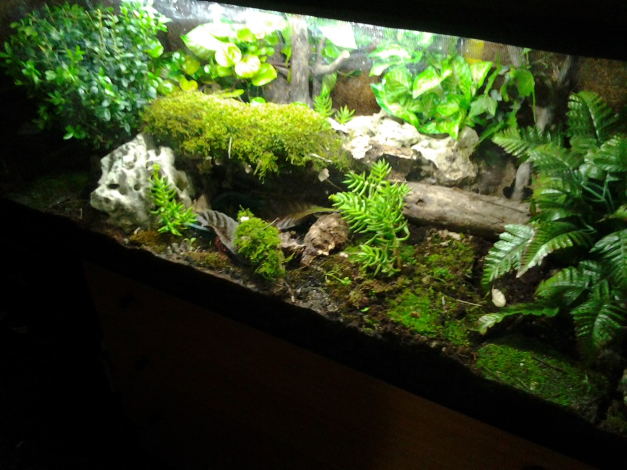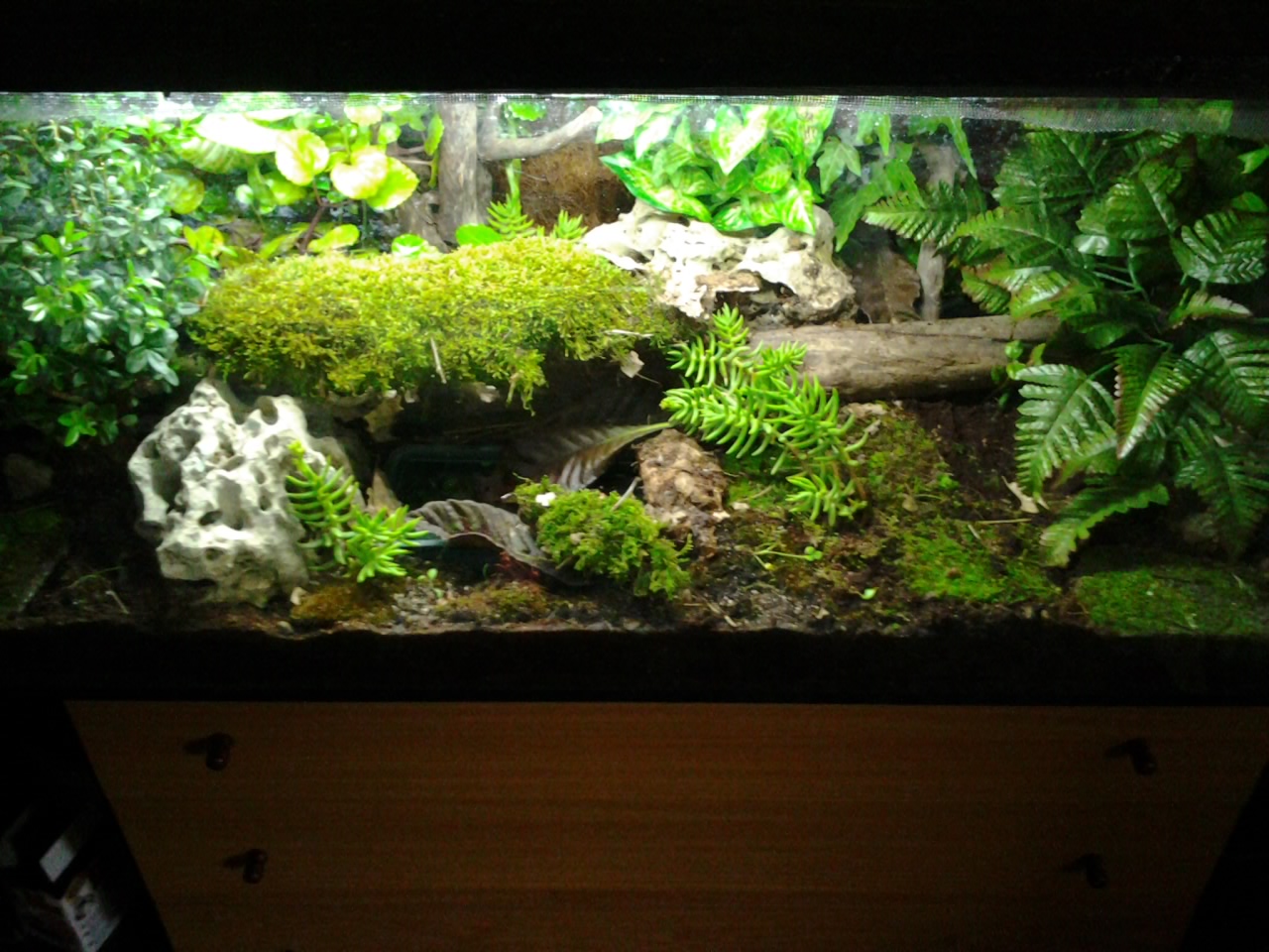 Ya no lo toco mas, mas o menos he conseguido la idea que tenia en mente, plantado por los laterales y fondo, en el centro un par de troncos con musgo y zonas despejadas para las terrestres a parte de varios refugios y hojarasca entre la vegetacion que a simple vista no se ven, , el recipiente de la charca lo rodeare con unas ramas que tengo cubiertas de musgo tambien y algunas piedras para romper esa forma rectilinea tan antinatural, pero eso es ya un detalle minimo.