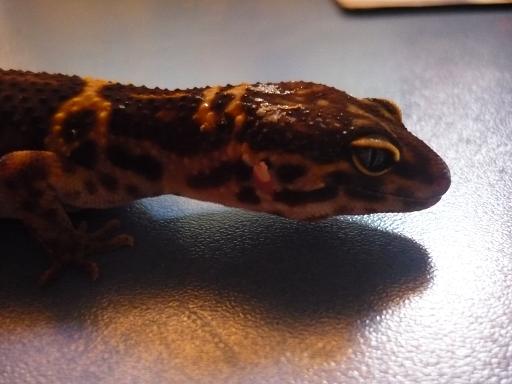 El animal es un gecko leopardo tremper albino,si te fijas la cola la tiene "arrugada" los eubles no tienen la cola asi,esto se produce cuando adelgazan,ademas has dicho que es una hambra adulta de 2 años con 28 Gr,cosa que no es normal en eubles,significa tambien que el anima ha bajado de peso,y si ademas te fijas en la foto se le ven mudas retenidas,los eubles cuando estan perfectamente mudan de forma "limpia" como mucho a veces se les queda algo en la puntita de los dedos,todos estos datos,aunque son muy pocos lo que indicarian a cualquiera es que o el animal pasa mas hambre que los pavos del tio manolo (cosa que por como dices que come y ha comido no es asi) o que tiene parasitos,por locual yo si fuese tu se lo miraria,espero haerte aclarado mi anterior comentario.
