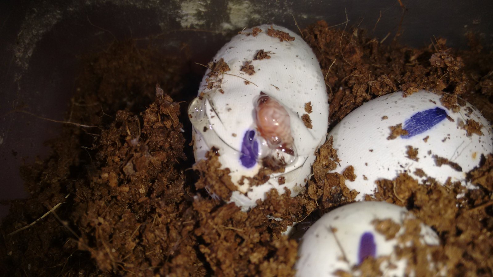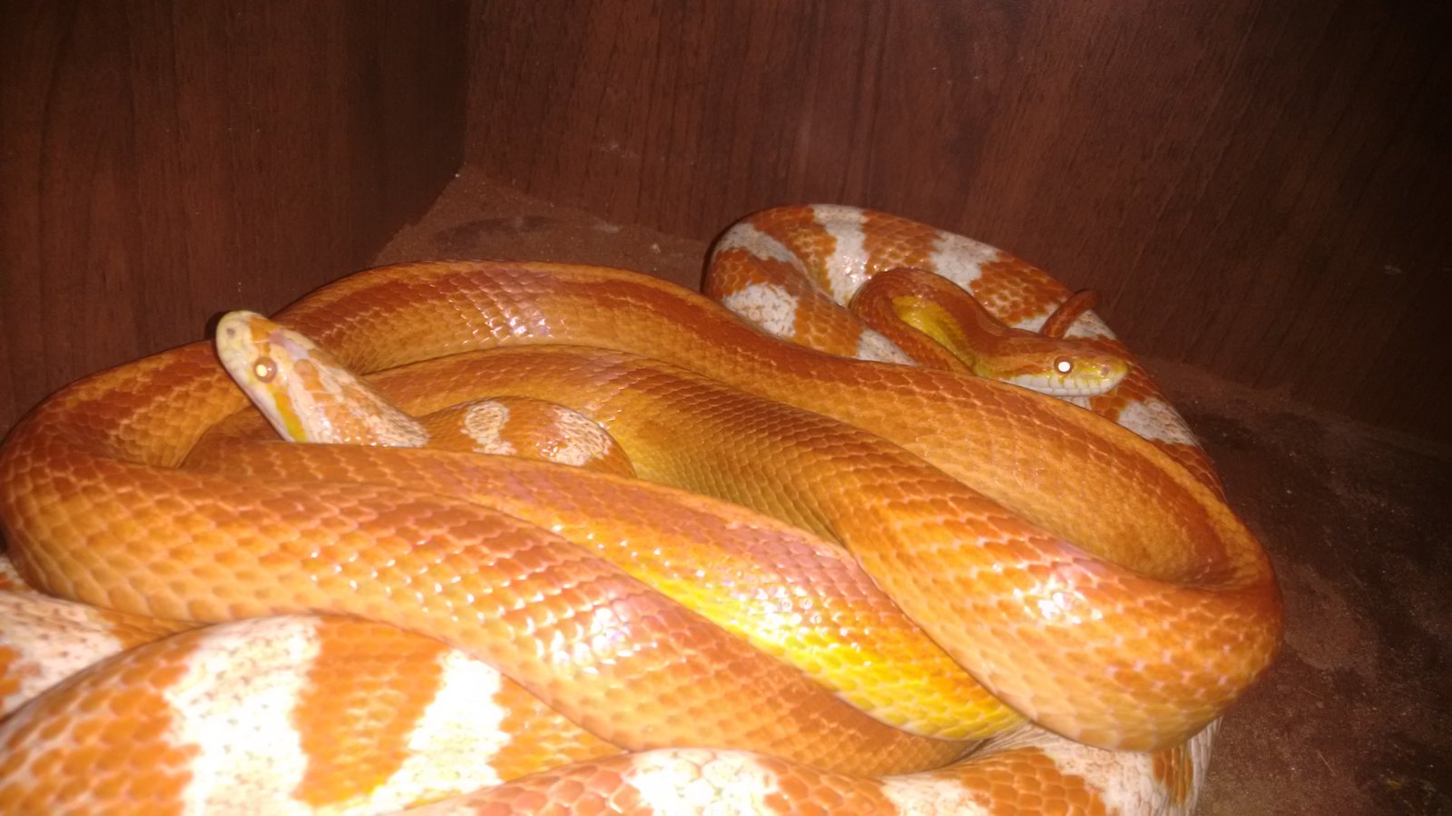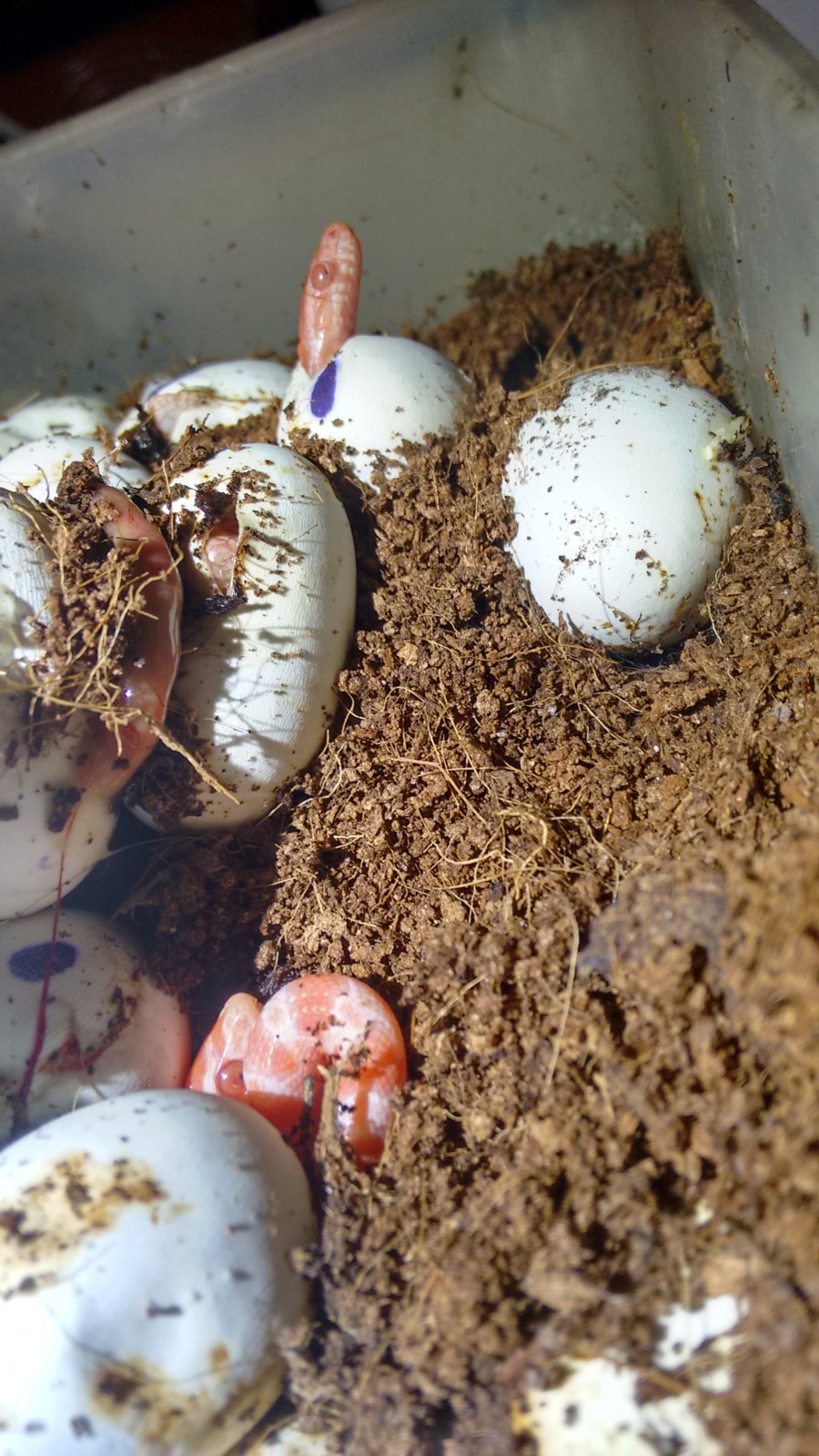 A principios de noviembre empezaron a hibernar, la habitacion al no bajar de 13 grados lo unico que hice fue desconctar aparatos electricos y que la hibernacion fuera natural, habitacion tranquila, oscura y que no les faltara agua, como iba a ser natural deje que la misma temperatura hambiente de la primavera las despertara (las demas serpientes tambien hibernaron aunque no iban a ser reproducidas) total que para finales de abril las junte y el macho no dudo ni lo mas minimo en perseguir a la hembra y a los 10 minutos ya tenian las colas entrelazadas! las deje juntas una que se siguieran apareando y asi fue las vi unas 3 veces entrelazadas en su cueva, las separe y al cabo de un mes la hembra me puso una puesta de 25 huevos! es la primera vez que lo hago y ver que sale bien, y la hembra me pone un numero tan alto de huevos y encima fertiles da bastante satisfaccion!.