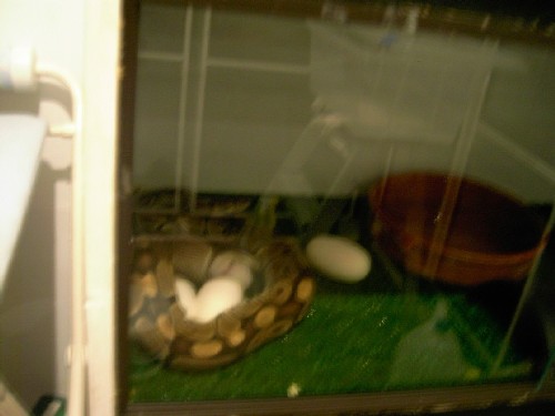 pues por el momento tengo estas fotos y sobre el modo para poder haber conseguido las copulas es el descrito por jesus, hay que darles temperatura y muchas pulverizaciones para una humedad muy elevada, no necesita hibernacion, y voy echandole al macho un par de hembras hasta que veo que copula con una y la otra se la retiro y a los 5 o 6 dias que se despegan le meto la otra hembra y enseguida la coge, las hembras son de un tamaño de sobre el metro veinte con unos 6 años de edad una y la otra que es hija de la de 7 años tienen ahora 3.5, el padre es muy chico de tamaño y de 7 años d edad, asi que una de las hembras es de granja supuestamente y la otra me nacio a mi hace el tiempo que he puesto pero la otra vez no las vi copular solo me encontre los huevos debajo de la madre se los quite y me nacieron dos crias y ahora tengo tres hembras y un macho, tengo probelmas para adjuntar fotos se lo he pedido a mi amigo jesus que las ponga gracias a todos y un slaudo.-