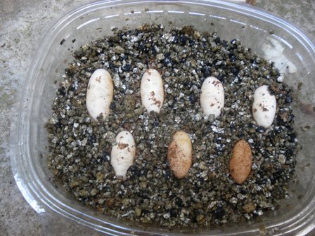 El año pasado vimos copulas pero ninguna puesta y este año por fin una puesta de estos varanos.Son 7 huevos aunque 2 de ellos creo casi al 100% infertiles(se aprecia en el color).Es una puesta bastante escasa para estos varanos pero puede que sea que la hembra es primeriza.Ahora a esperar unos 120-170 dias y que marche todo bien,un saludo.