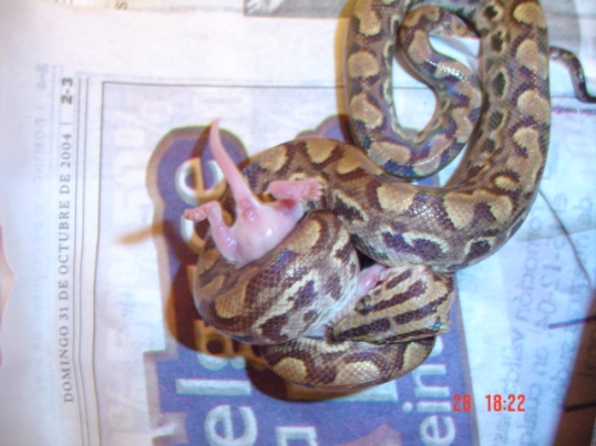 Lo mas grande que he tenido en serpientes ha sido una molurus y darle de comer supuso toda una barrera para mi. Cuando mi "Limon" dio el salto de la rata al conejo, no me quiero ni acordar. Como anecdota dire que el primero que pille, lo regale, no pude darselo o_O . Hasta que claro, me hice a que me gustaba mas mi piton que los conejos, y tenia que resignarme a ello.