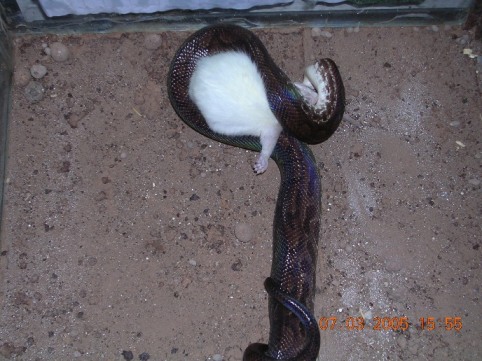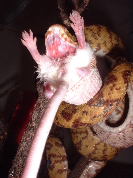 Desde matar ratones, ratas y pollos, hasta tener que intervenir para frenar las patas taseras de un conejo y evitar que las patadas (defendiendose durante la constriccion de mi molurus) no dañaran a mi mascota. Osea que, que yo opine que dar de comer a una serpiente sea de lo que menos me gusta de ellas, no creo que sea porque no soy aficionado ni tenga experiencias para contar a cerca de esto.