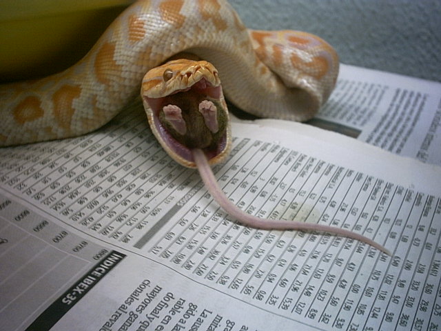 obvio, esto es un foro de serpientes y justamente la alimentacion es parte de ellas, ademas, es lo mas normal del mundo ver comer una serpiente y la foto de la serpiente q empezo primero con el culo del raton es extrañisima por eso justamente, es interesante.