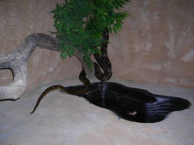 La decoracion es de cemento, pero está forrado de pladur. La galería está enteramente aclimatada y ademas dentro del terrario hay una resistencia de 200 W para dar mas temp. Hoy 23 de Enero, con cierta rasca en la calle, se ha jincado de golpe 2 presas....osea k funciona...jajaj