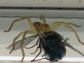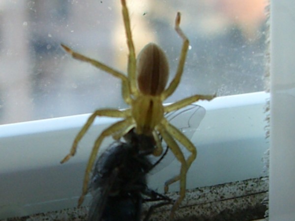 alguien sabe que especie de araña es esta me la encontre en la ventna de mi habitacion y le estube sacando un par e fotillos tenia un moscon bastante grande agarrao y que todabia estaba medio vivo