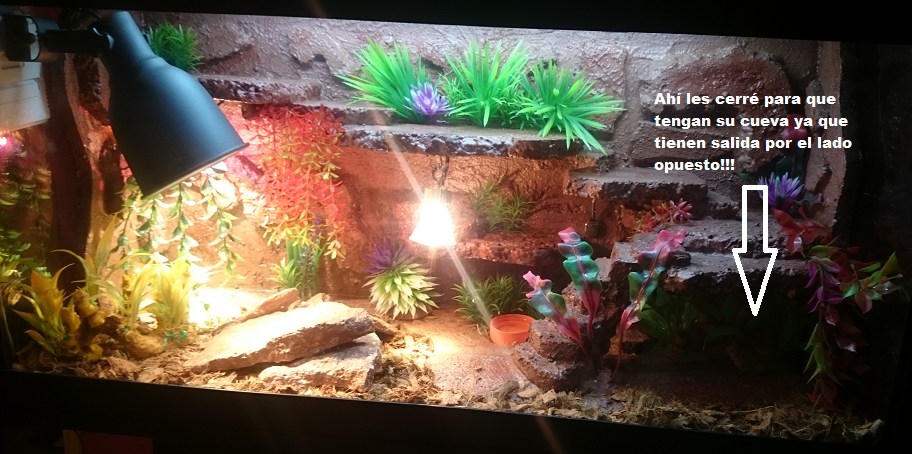 El terrario, como podéis ver en la foto, lo hice con porexpan, una capa de mortero mezclado con arena y por último una capa de barniz (todo con componentes no tóxicos).