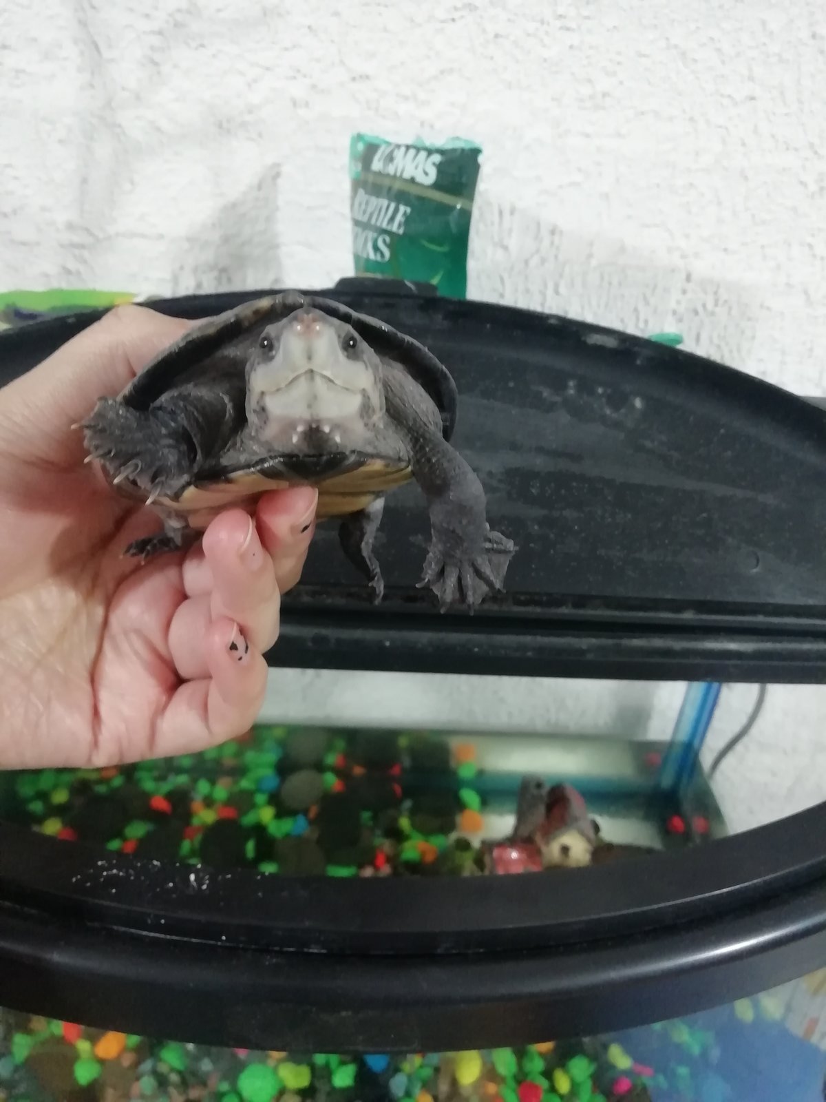 caparazón algo café cuando recién la tuve era un color algo olivo, en la cabeza tiene manchas verdes, en el área del cuello tiene unos picos y en la cola, la punta de su nariz es algo rosada, suele ser agresiva, en las noches es activa (se la pasa moviendo las piedras de la pecera), el pecho es amarillo.