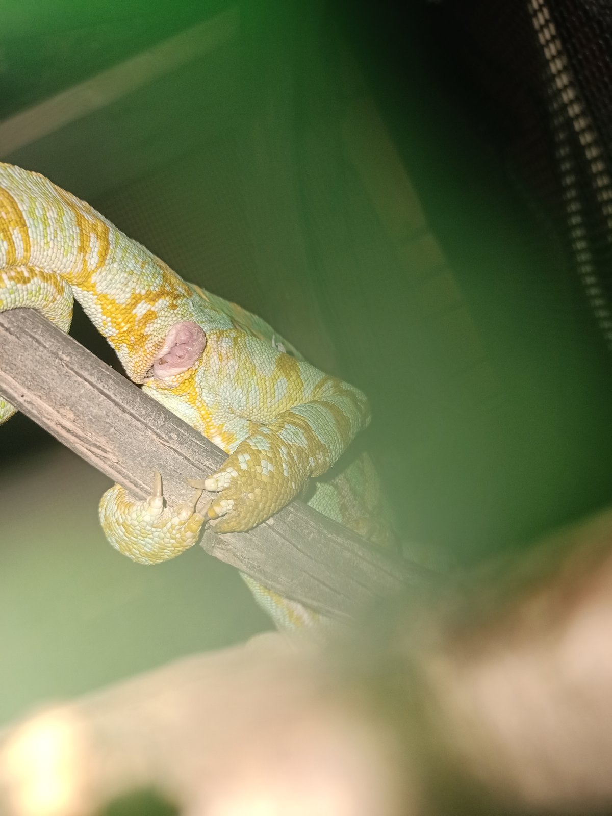 Pero esta noche me lo he visto en el suelo, de un color bastante claro (algo más claro que su color de dormir normalmente), no es nada habitual en el ya que siempre duerme en lo más alto del terrario.