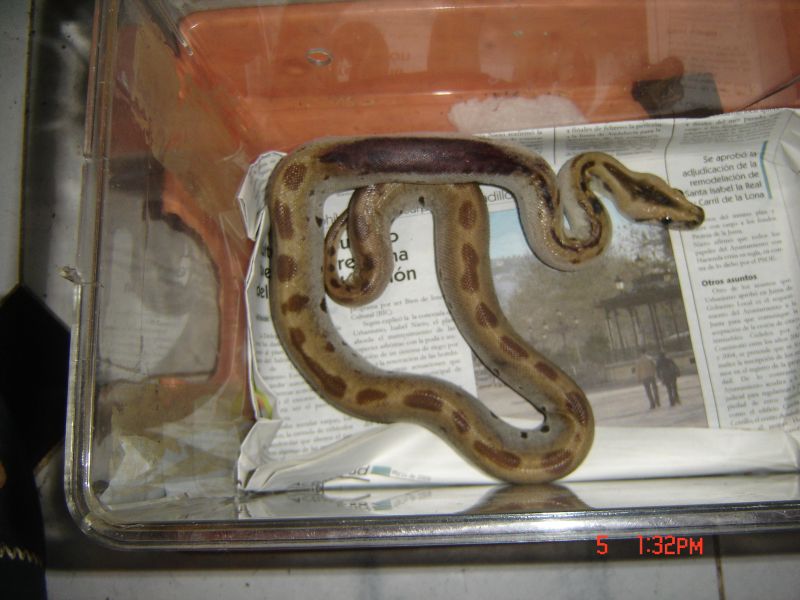 Esta mañana las mire, y me parecio verle la zona que ahora esta morada, un poco inchada, pero la serpiente estaba normal y pense que seria por la postura, pero hace unas horas cuando vine, me encontre con que a mudao, y la zona que se veia inchada, mirad que color tiene!! que le pasa? parece como un derrame interno o algo asi. La verdad a primera vista parece quemadura, pero ya os digo que no lo es.