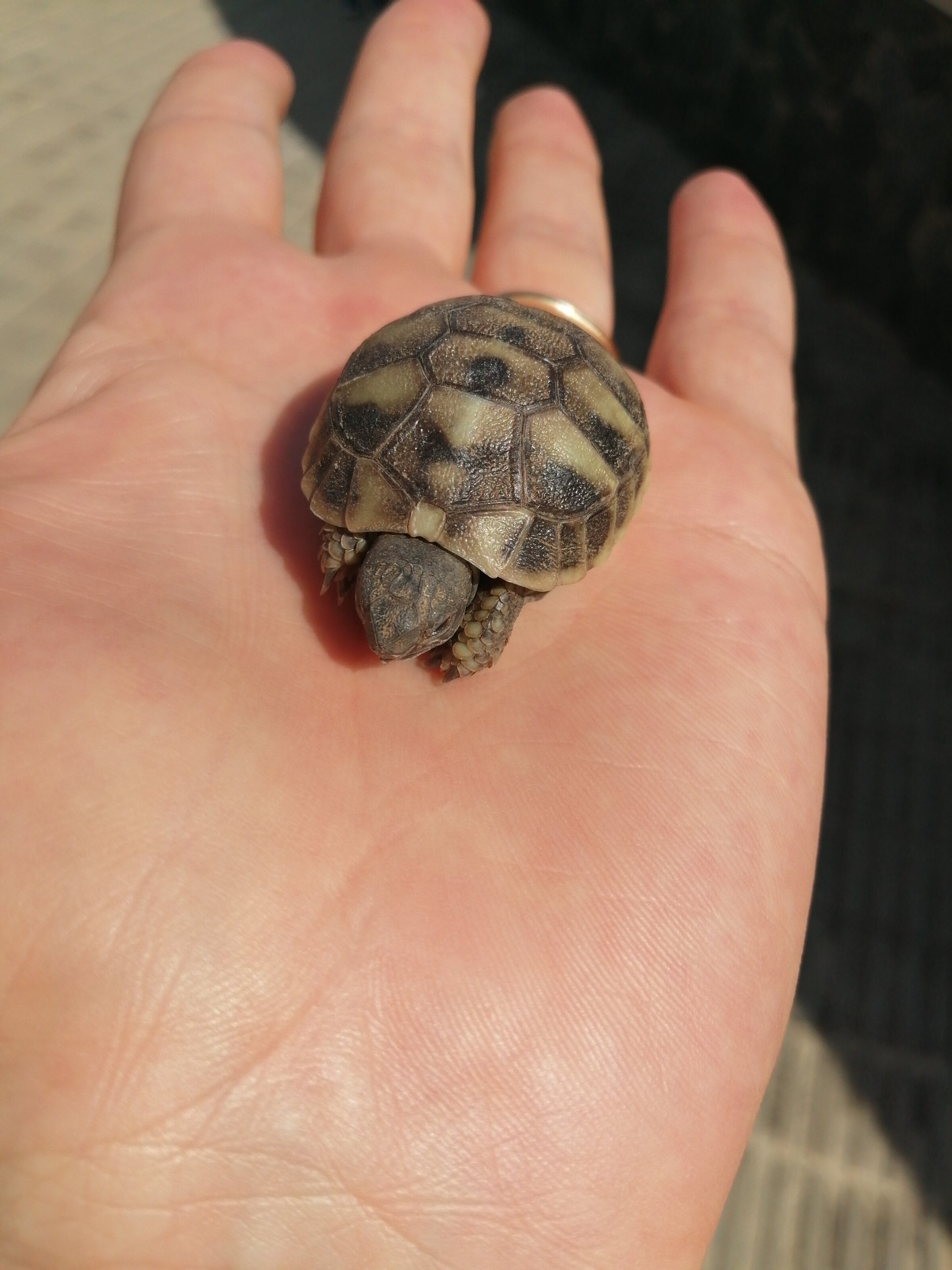 La encontré en medio de una calle transitable por eso la cogí. Corría peligro. Hoy es fiesta en Barcelona. Mañana la llevaremos a la protectora de animales. GraciasEs una especie protegida. Déjala donde la encontraste.