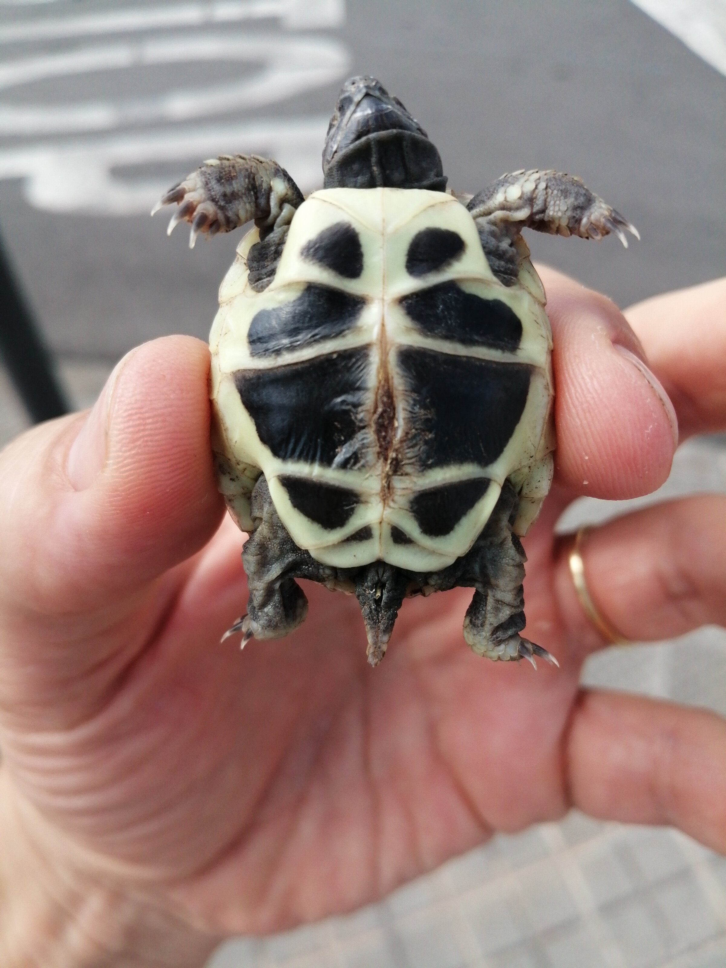 Hola he encontrado esta tortuga y no se de qué tipo es ni si es invasora. Me podéis decir? Si debo llevarla a una protectora de animalea o qué come? Gracias