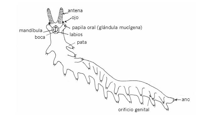 Coloración variable: verde, azul, naranja, negro. Depredadores y omnívoros. El cuerpo tiene papilas con una espina o escamas, dispuestas en forma circular. En la parte anterior presenta un par de antenas, un par de papilas orales, los ojos y la boca. En las papilas orales desembocan las glándulas mucígenas que producen una sustancia que utilizan como defensa y para capturar a sus presas A lo largo del cuerpo tiene pares de patas, entre 14 y 43; son cónicas y huecas y en su extremo tienen una almohadilla y un par de uñas. No presentan segmentación visible pero las patas marcan los metámeros.