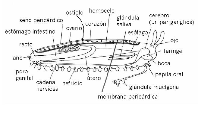 SISTEMA CIRCULATORIO: Es abierto; consta de un corazón tubular dorsal con un par de ostiolos en cada segmento. Está incluido en una cavidad, el seno pericárdico.
