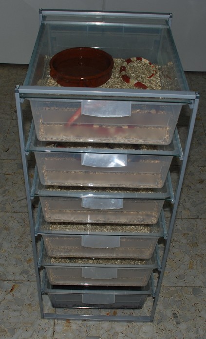 En este yo mantengo serpientes y la verdad solo tuve que hacerle un apaño que es en los marcos por dentro hay un hueco en el que las serpientes se meten para poder forzar el plastico del cajon, el remedio que puse fue con churros de periodico rellene esos huecos y con cinta aislante negra la deje fijada bien sin dejar huequitos(en 10 mins haces los 4) y no se nota al ser la cinta aislante negra y hacerla con cuidado y me van de lujo para colubridos babys y algunos boidos baby, de hecho en el cajon de abajo que veis que esta preparado tenia hasta ace poco una Epicrates Cenchria Cenchria baby pero ya la tuve que mudar jejeje.
