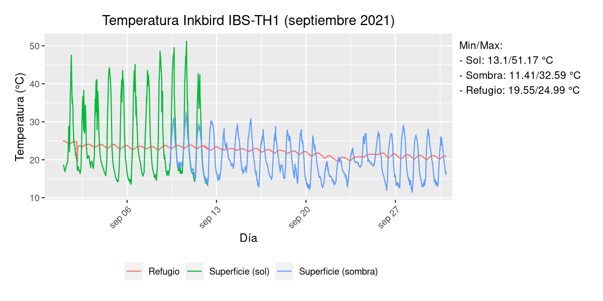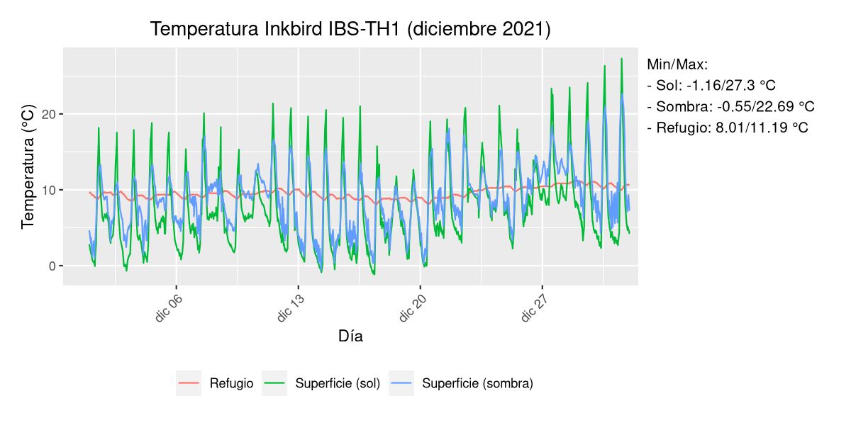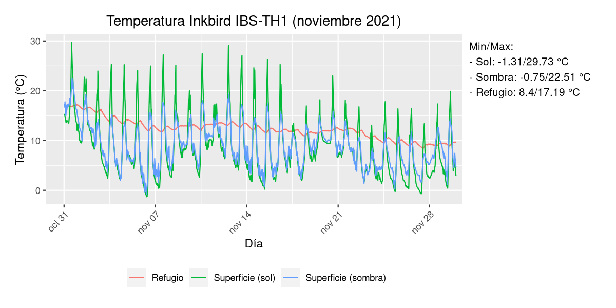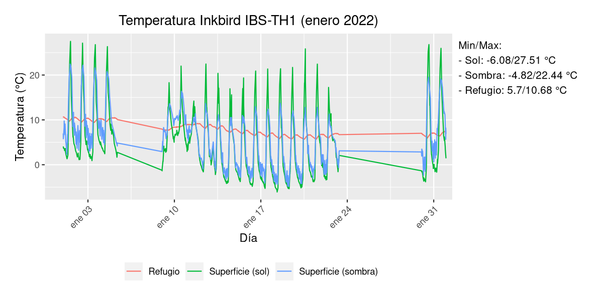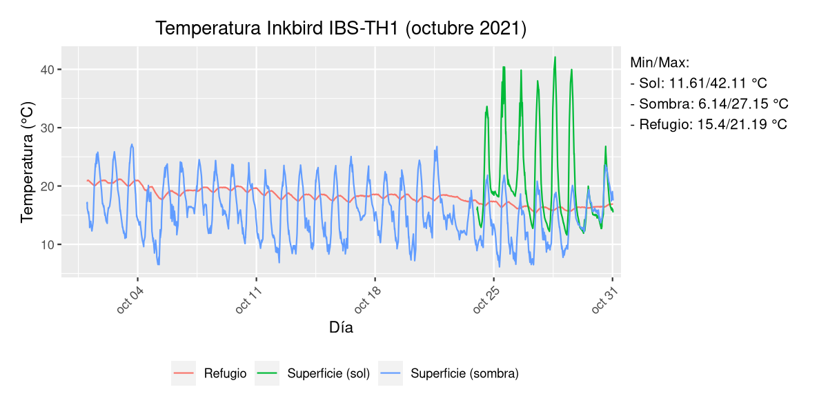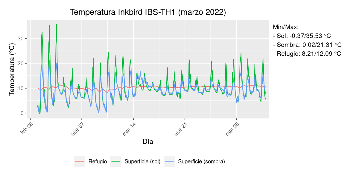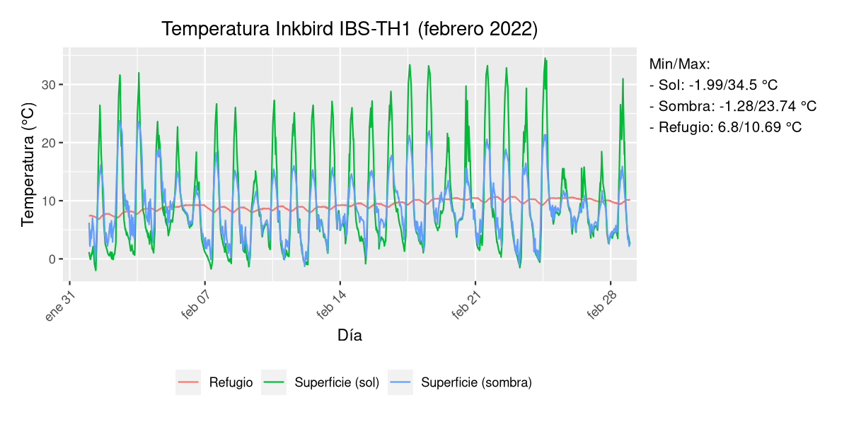 Es una zona del norte de Alicante (Ibi) y justo coincidió con el temporal que vino hace unos días pero es curiosa la amplitud térmica de la sonda expuesta al sol. Por lo demás todo parece tener cierta lógica: el refugio bajo tierra es estable y el de la sombra al estar más protegido tiene mínimas y máximas más contenidas que el otro.