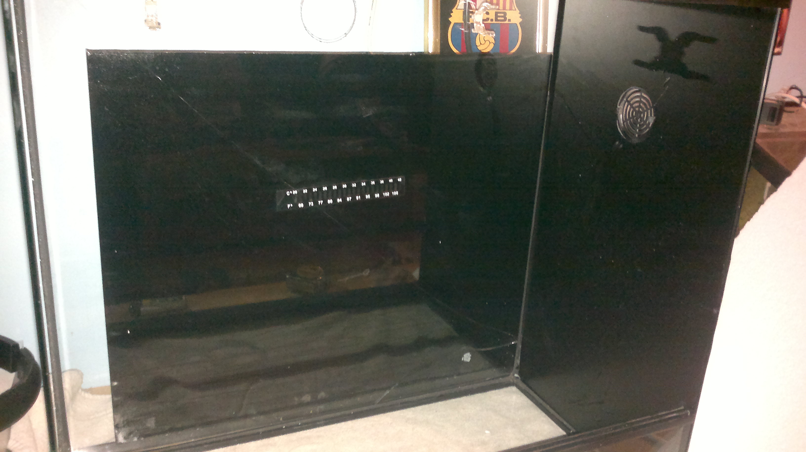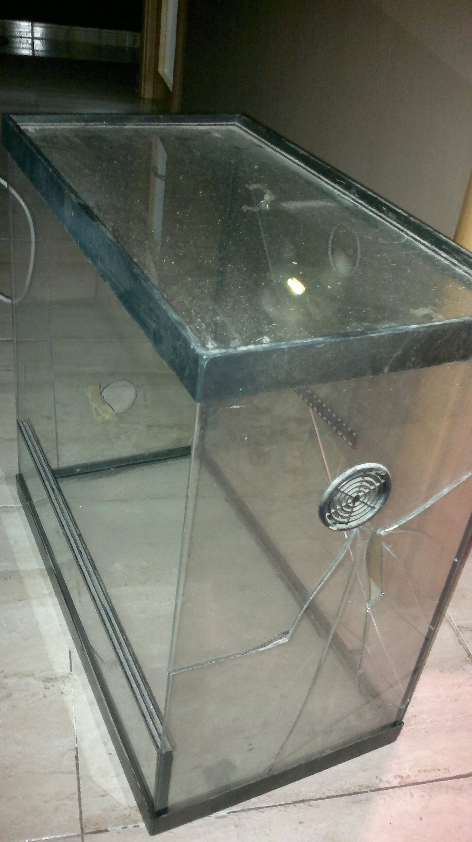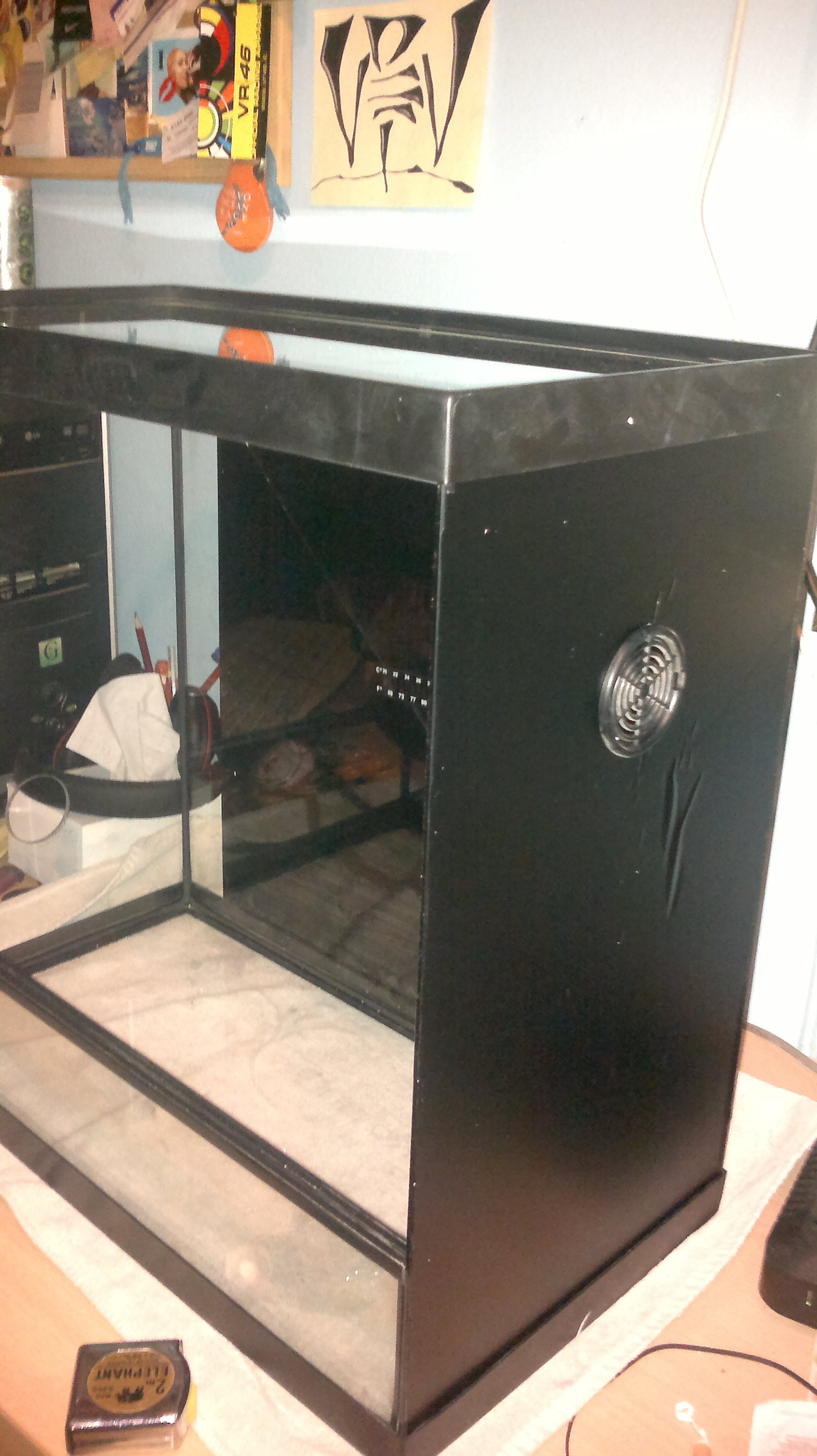El cristalero no me podía hacer los agujeros y no me quiso reparar el terrario, según el, no le salia a cuenta hacerlo. Así que tuve que tapar y reparar el cristal con vinilo adhesivo, por ambas caras del cristal.
