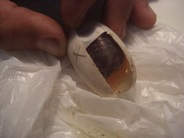 Pues nada! Lo he abierto y me he encontrado a una joven Rhinoclemmys mirándome descaradamente, el huevo se ha abierto en dos mitades simétricas, pero me da la sensación de que a la tortuga aún le queda por desarrollarse. En fin, he cerrado el huevo como he podido y lo he vuelto a meter en la incubadora :confused: