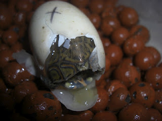 Bueno, pues ahora acabo de mirar la incubadora y ya me ha nacido una preciosa elongatita... y justo en la tarrina de al lado he observado un huevo de Rhinoclemmys con una pequeña fisura que supuraba. No estaba seguro de como proceder, he pensado que quizás el huevo estaba malo y empezaba a descomponerse... pero no olía mal. También he pensado que quizás el animalico no podía salir y como la puesta es de finales de enero...