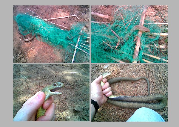 Hace unos días unos compañeros encontraron en la falda de la Sierra de Collserola, en la ciudad de Barcelona, esta serpiente que se había liado en una malla que algun desgraciao había tirado en el bosque. Me llamaron y fuí al día siguiente al mismo lugar "armado" con unas tijeras y un transportín (este último únicamente por si la serpiente se había herido/cortado con la malla).