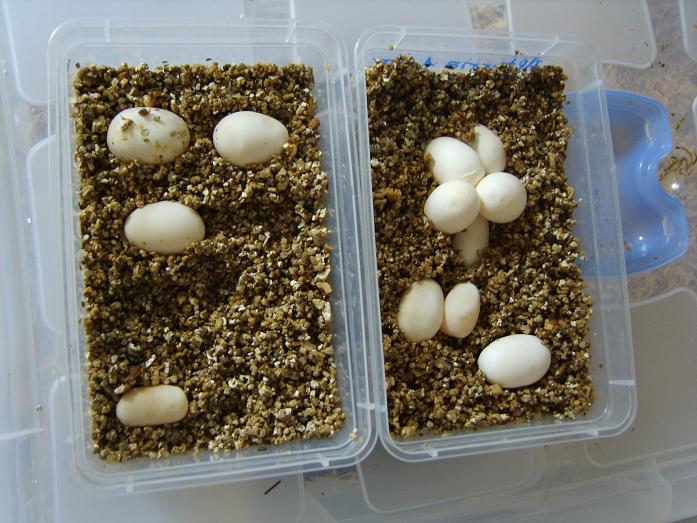 Se ha tirado todo el dia de hoy poniendo huevos, al final han sido 14 en total. Todos supergrandes para el tamaño de la hembra excepto 2 que han salido canijos y un poco deformados, como si no hubiesen tenido espacio en el interior de la hembra para crecer con forma normal. Les daré unos dias para ver si son o no fértiles, aunque ya en varios de ellos se aprecian venitas. A ver si se desarrollan bien!