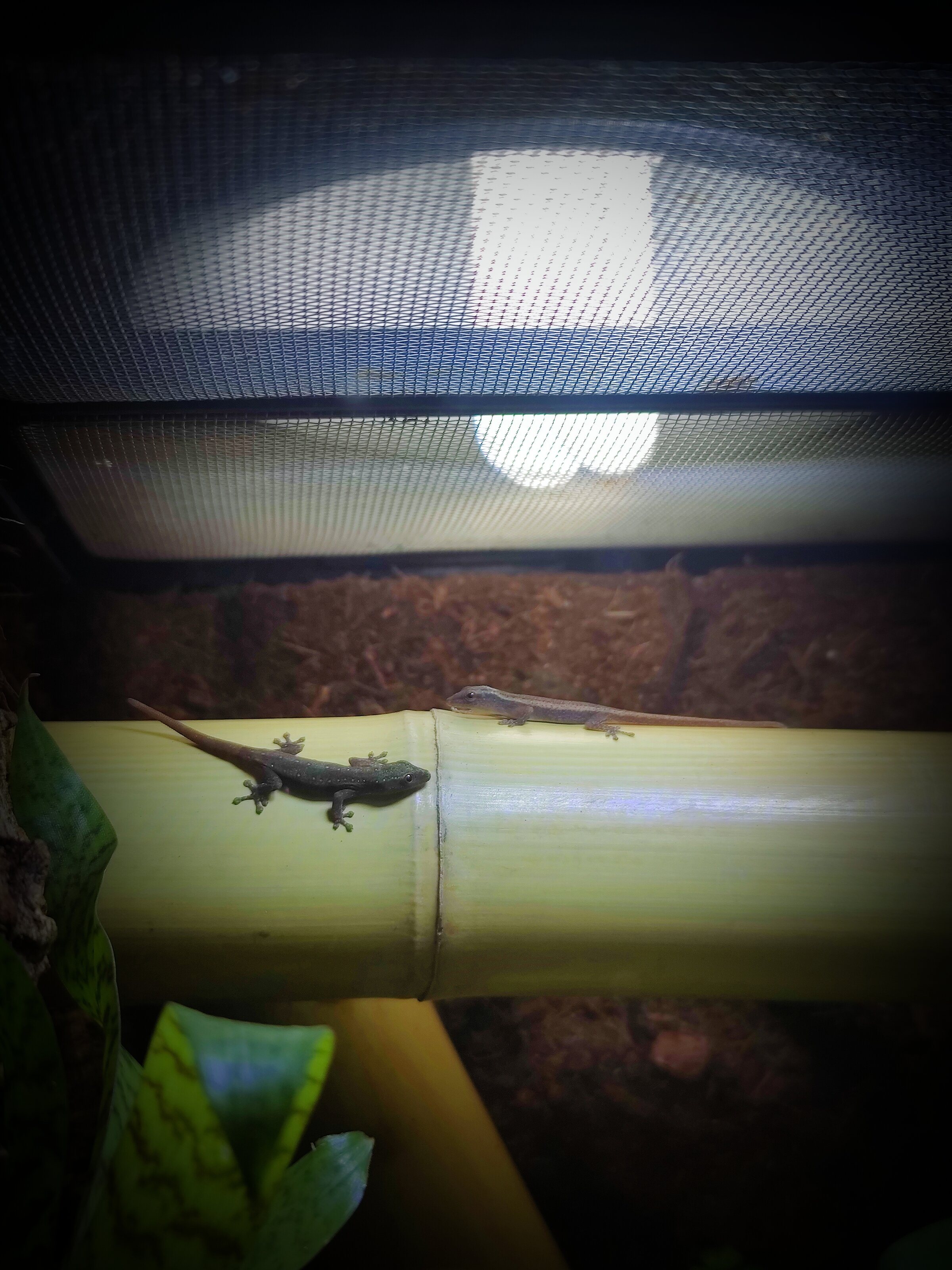 Hola buenas tardes , busco algo de ayuda para los que tienen o entienden un poco sobre los lygodactylus en concreto los conraui , hace poco adquirí una pareja 1.1 y no estoy convencido al 100% que sea macho y hembra , ya que estos reptiles se diferencian mucho el macho de la hembra por los colores llamativos del macho, colores que el mío no tenía cuando llegó y sigue sin tener una semana después , puede ser que algunos no tengan ese color ? O que sean muy jóvenes aún ? El vendedor me dice que si son 1.1 pero son muy parecidos de coloración aunque uno tiene más tamaño que otro