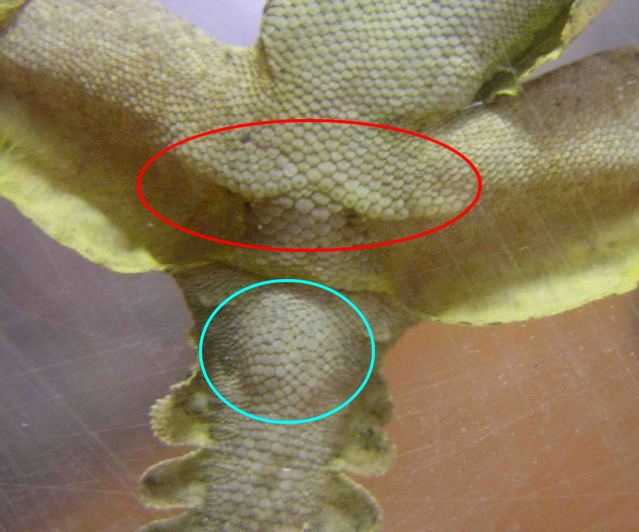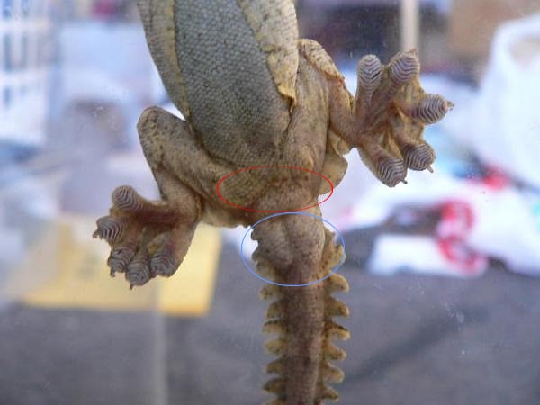 Como se puede ver, los machos tienen los poros femorales más engrosados y visibles, y sobre todo se aprecian los bultos de los hemipenes.